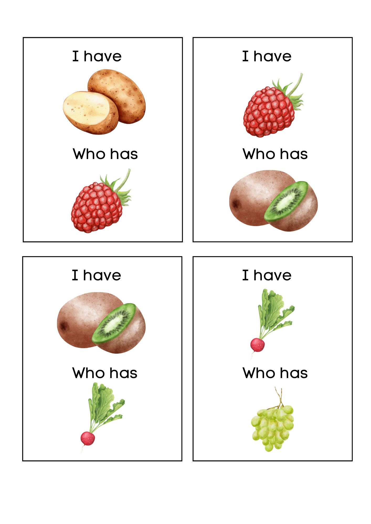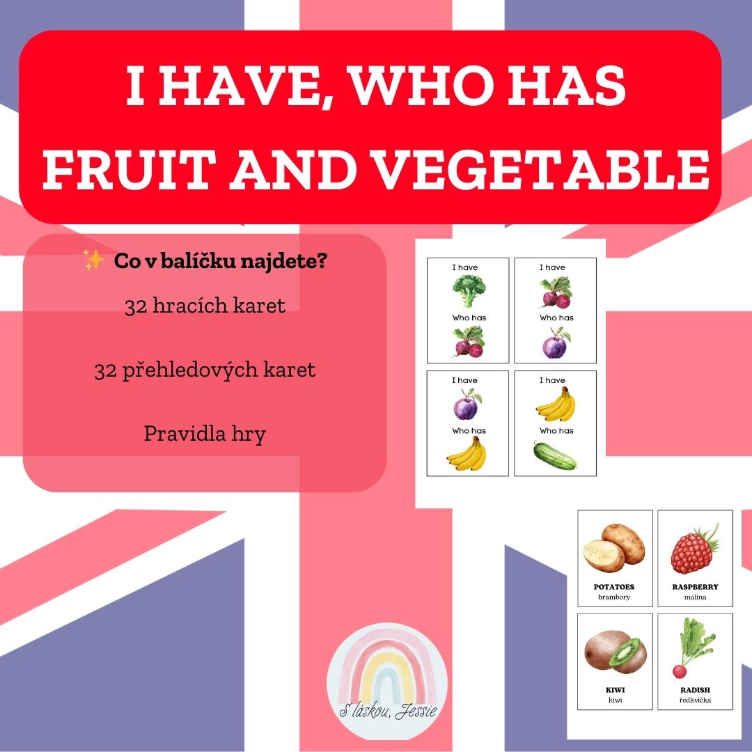 Zábavná a dynamická karetní hra „Já mám, kdo má?“ 🎴 zaměřená na slovní zásobu ovoce a zeleniny v angličtině 🇬🇧. Ideální pro výuku angličtiny hravou formou ve třídě 🏫, družině i doma 🏠.