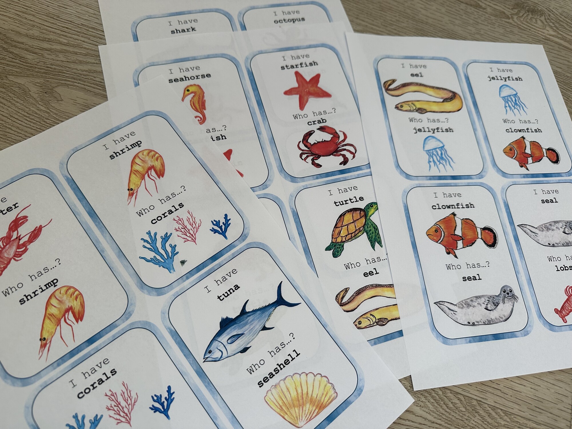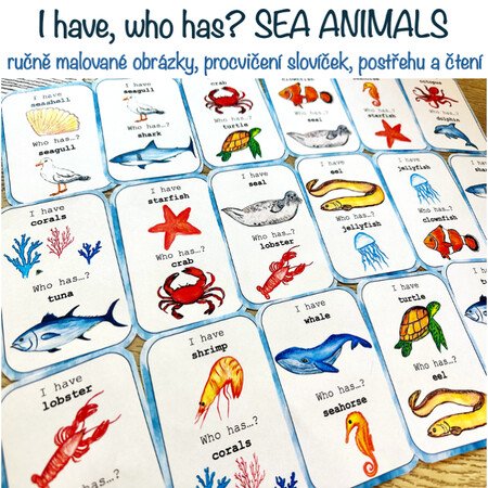 Materiál obsahuje 5 A4 stran hry – 18 karet s ručně malovanými obrázky na téma Sea Animals. Procvičení slovíček a postřehu.