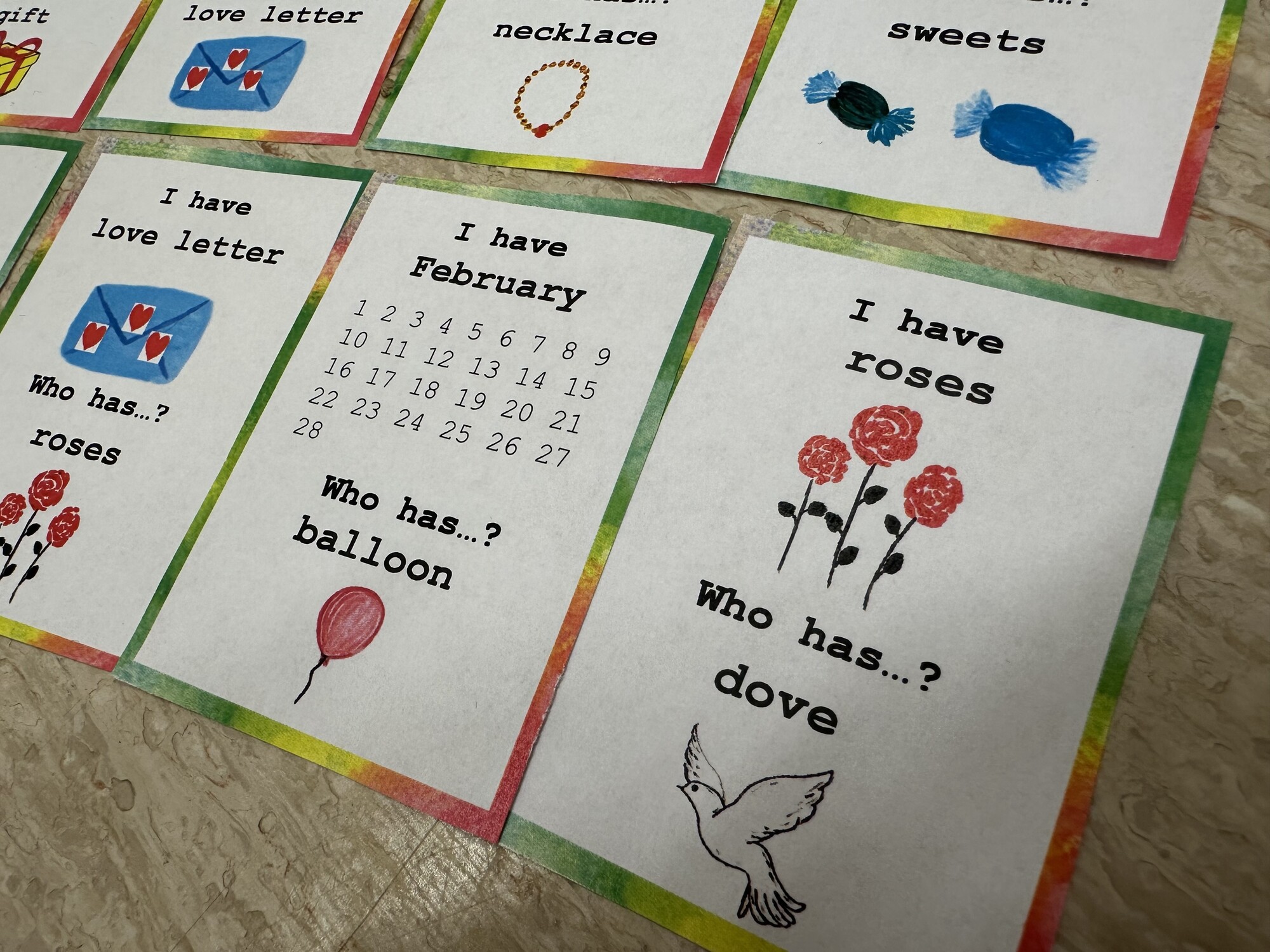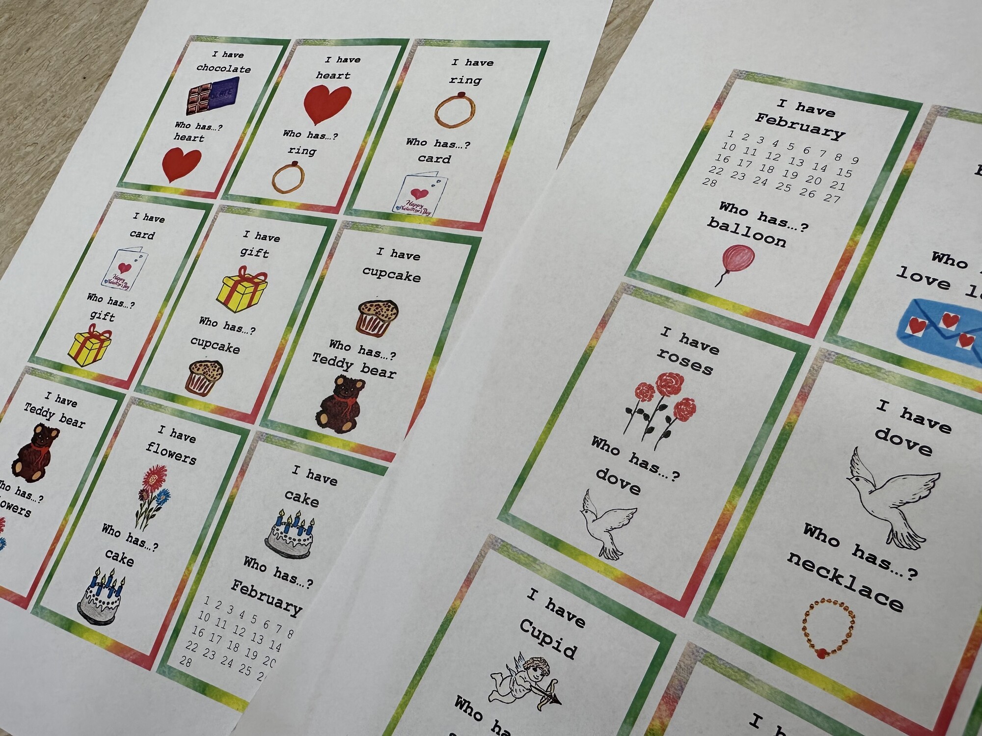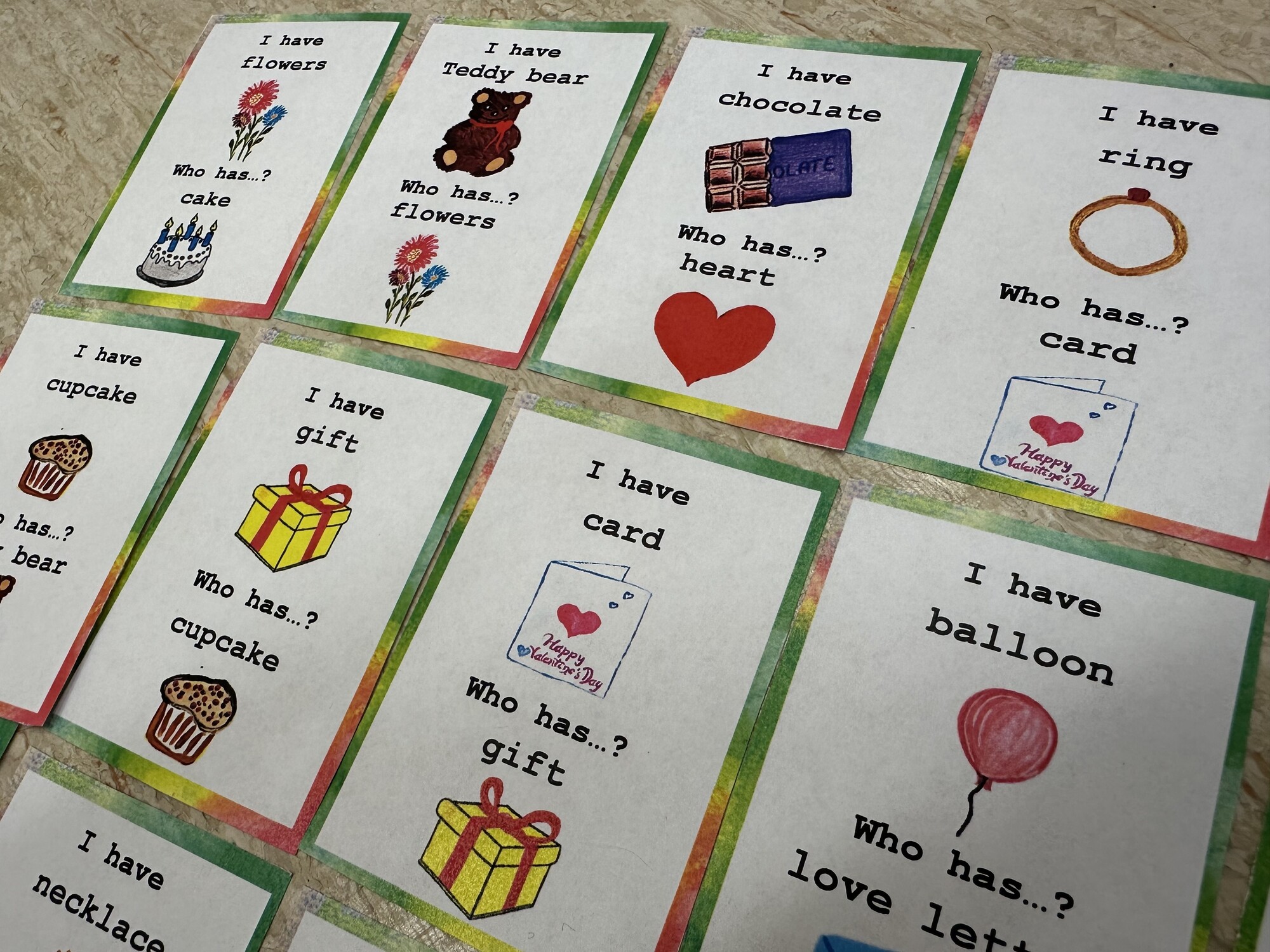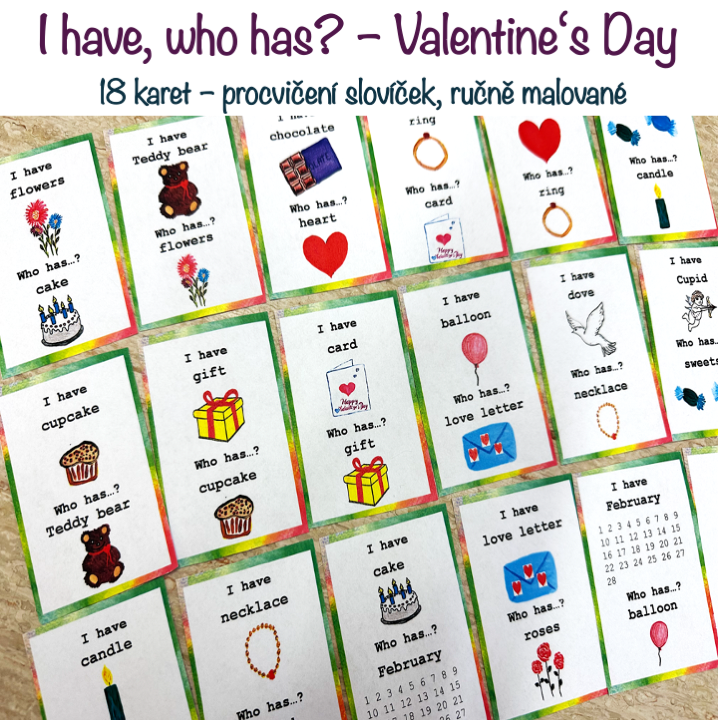 Materiál obsahuje 2 A4 strany karet hry I have, who has na téma Valentýn a pravidla hry. Procvičuje se čtení, slovní zásoba, postřeh. Ručně malované obrázky, 18 karet.
