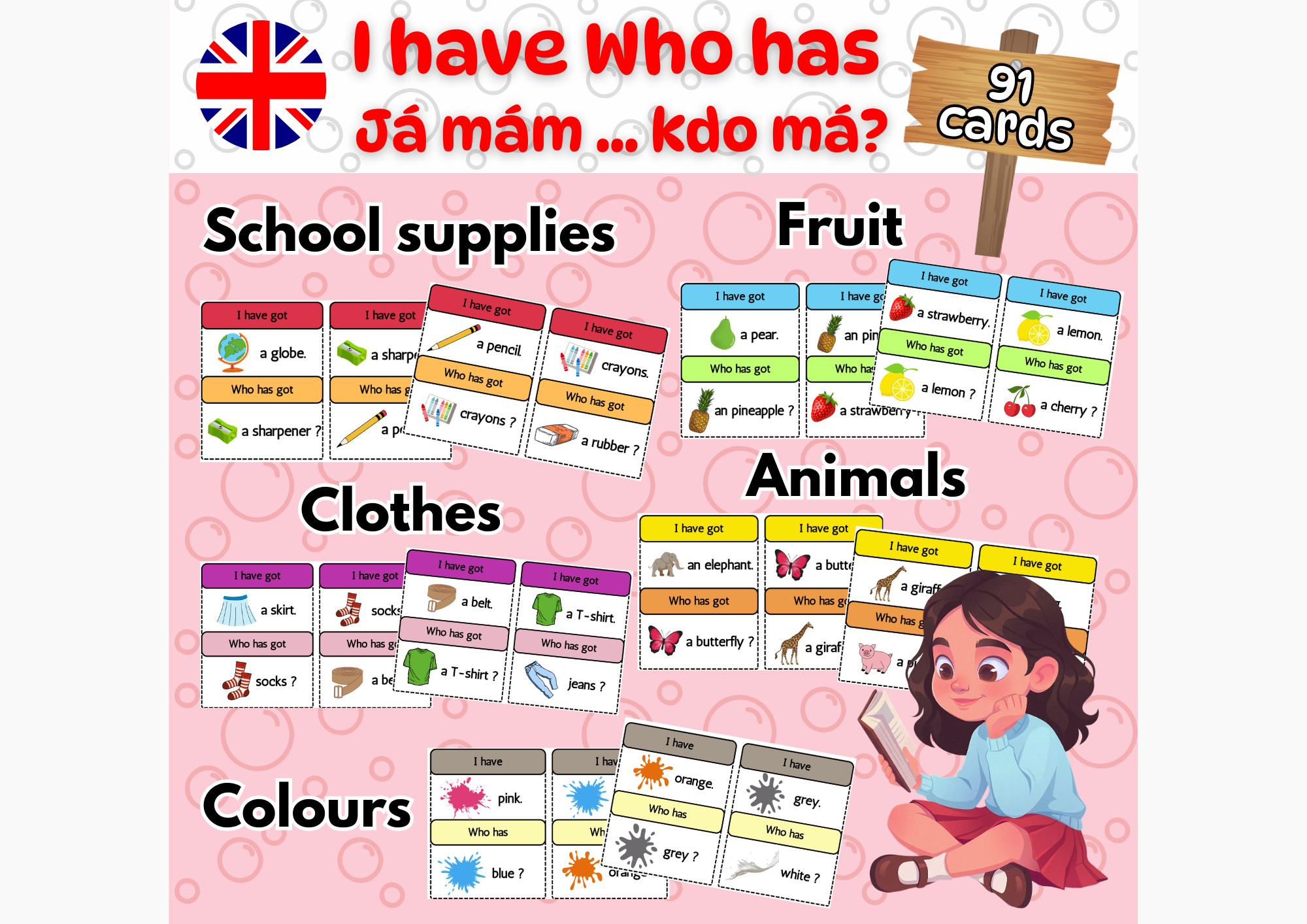 Kartičky nabízím na témata - školní pomůcky, zvířata, ovoce, barvy a oblečení.