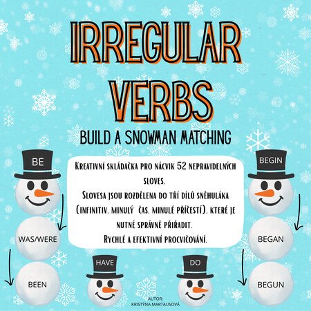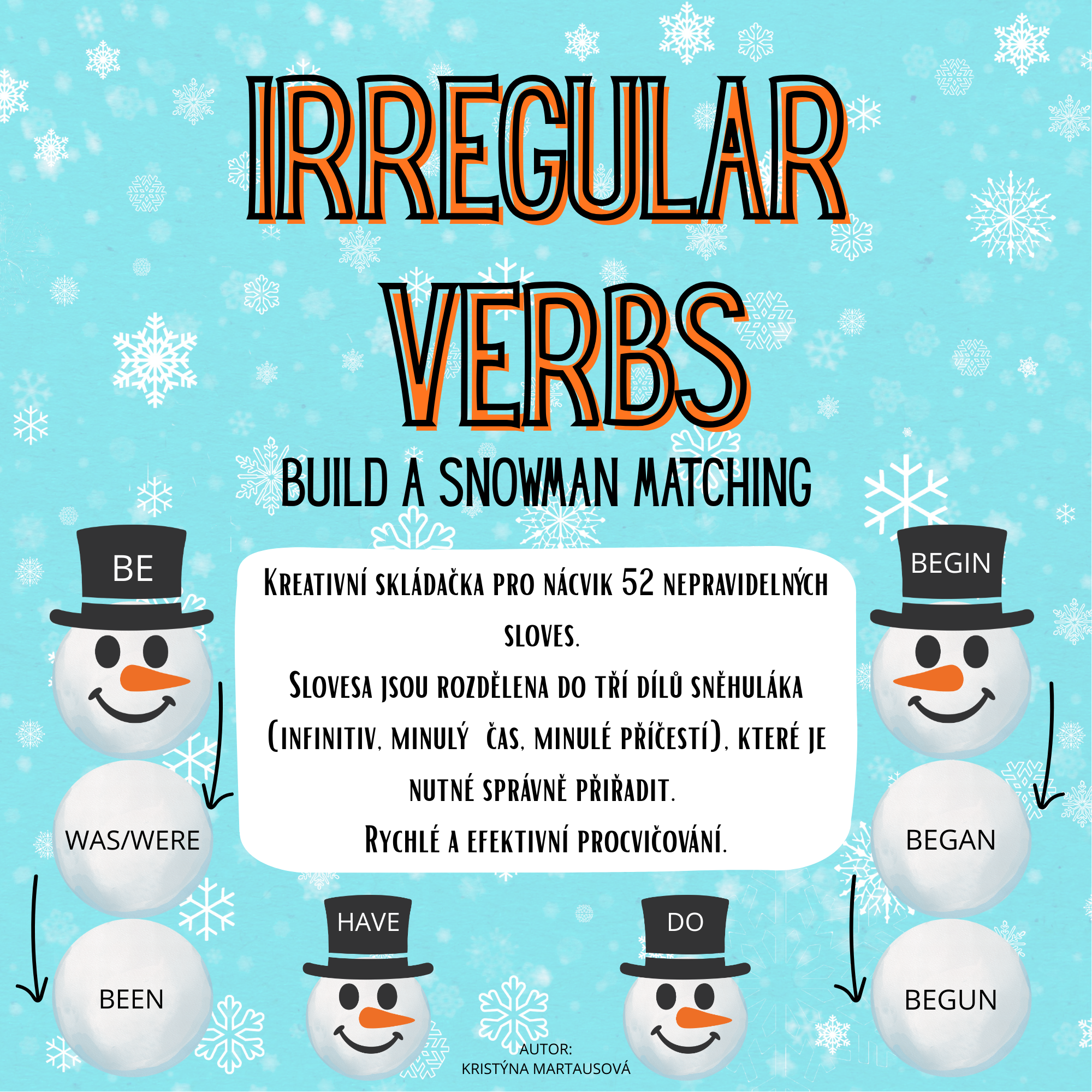 Slovesa jsou rozdělena na tři díly sněhuláka (infinitiv, minulý čas a minulé příčestí), které musí žáci správně složit k sobě. Skládání sněhuláků je vizuální a paměťová kotva pro bezchybné zvládnutí všech tří forem.