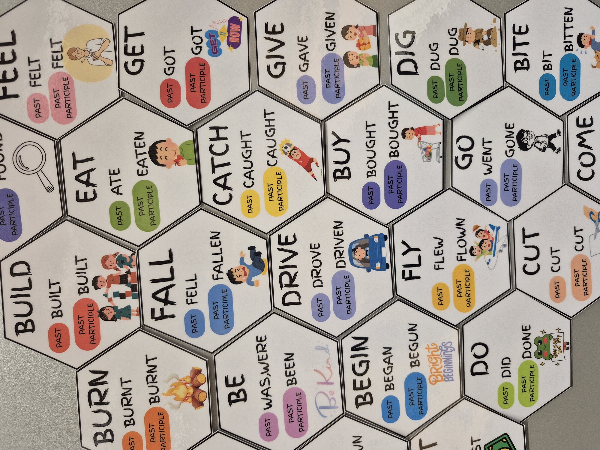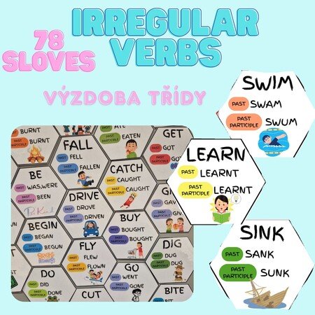 U každého slovesa past simple, past participle a obrázek.