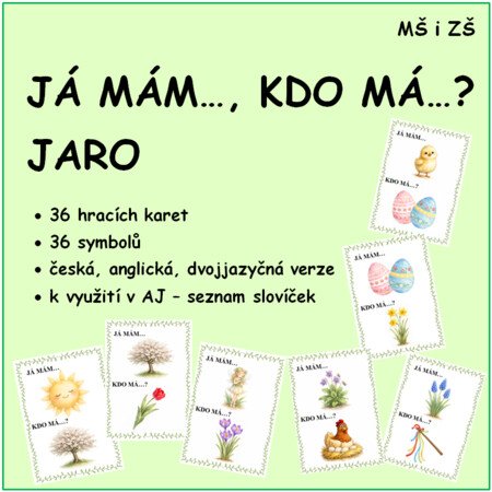 Materiál obsahuje 36 kartiček v české, anglické i dvojjazyčné verzi, 36 obrázků, které souvisí s jarem a přehled anglických slovíček.