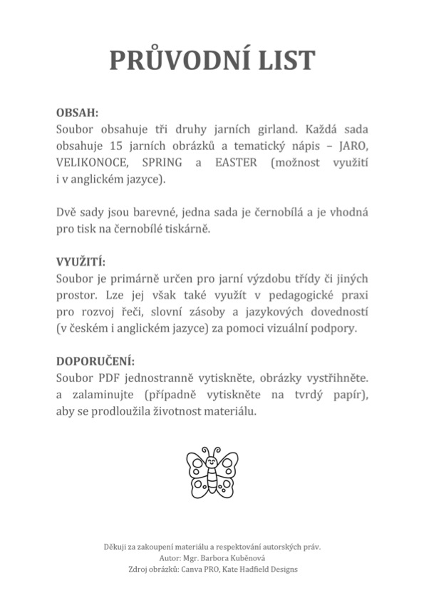Soubor obsahuje tematické girlandy s jarní a velikonoční tematikou, které lze využít nejen k dekoraci, ale i při výuce.