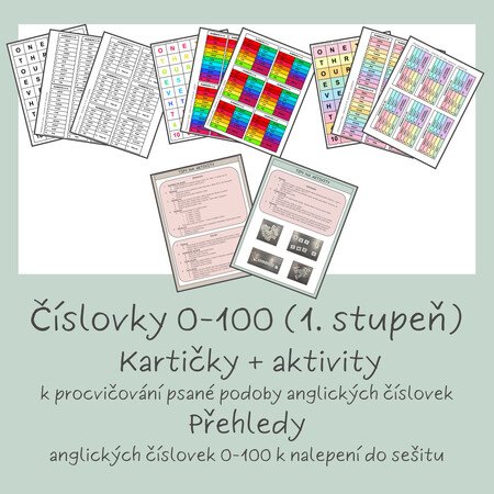 - Kartičky s písmeny číslovek – postupně od 0–12, 13–19 až po 20–100 (desítky).