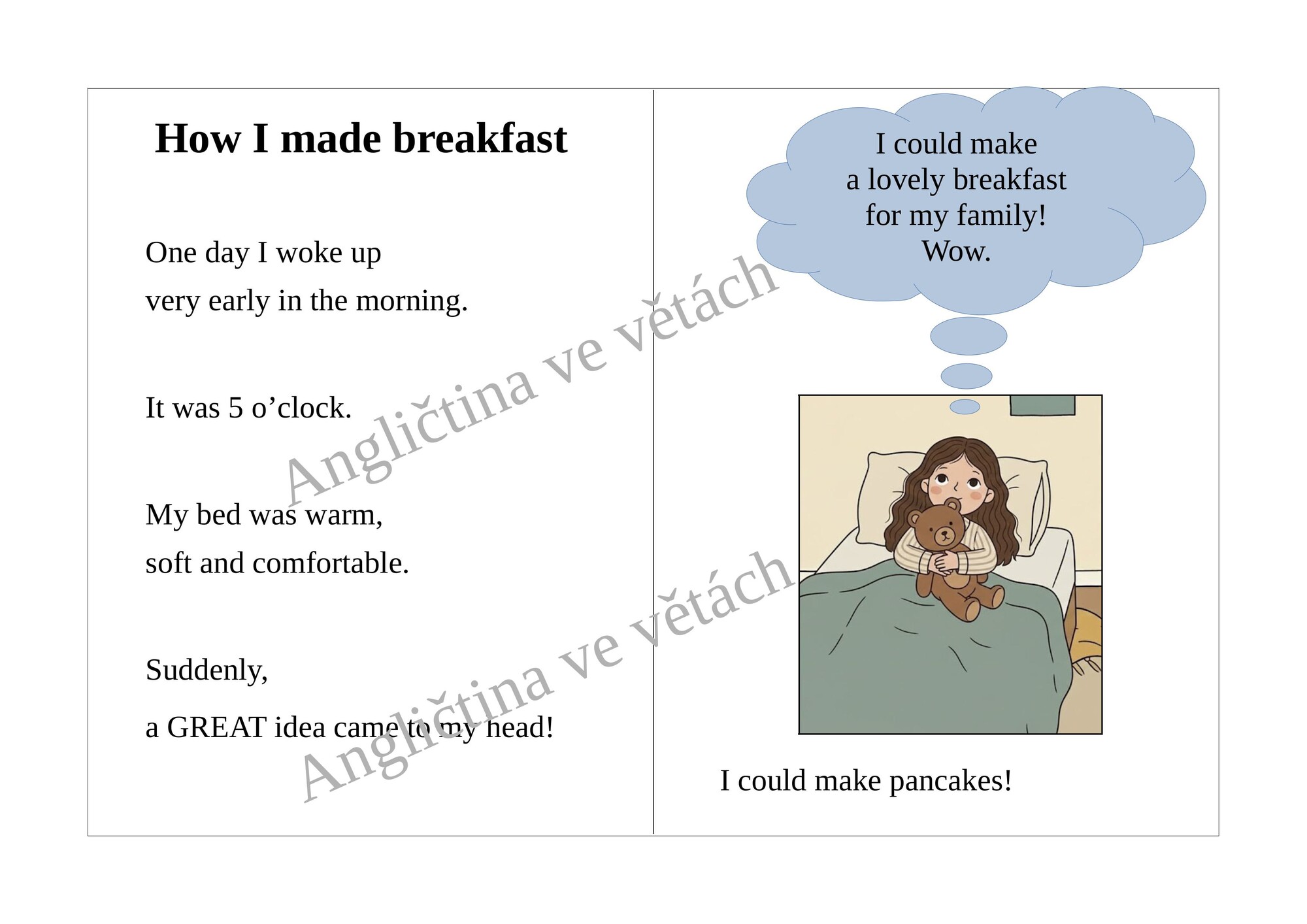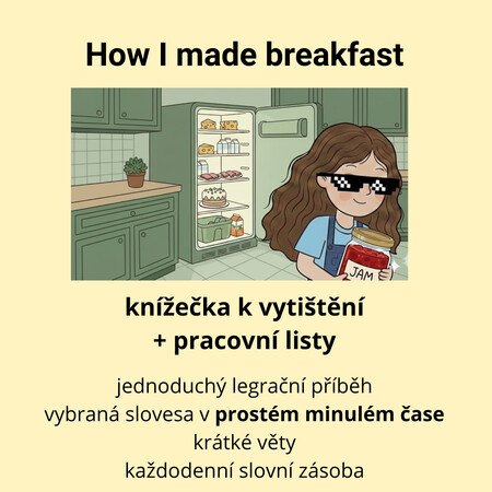 Krátká knížečka vypráví humorný příběh o dívce, která se brzy ráno probudí a rozhodne se připravit snídani pro celou rodinu. V kuchyni se však do jídla pustí sama a její plány nakonec dopadnou trochu jinak…
