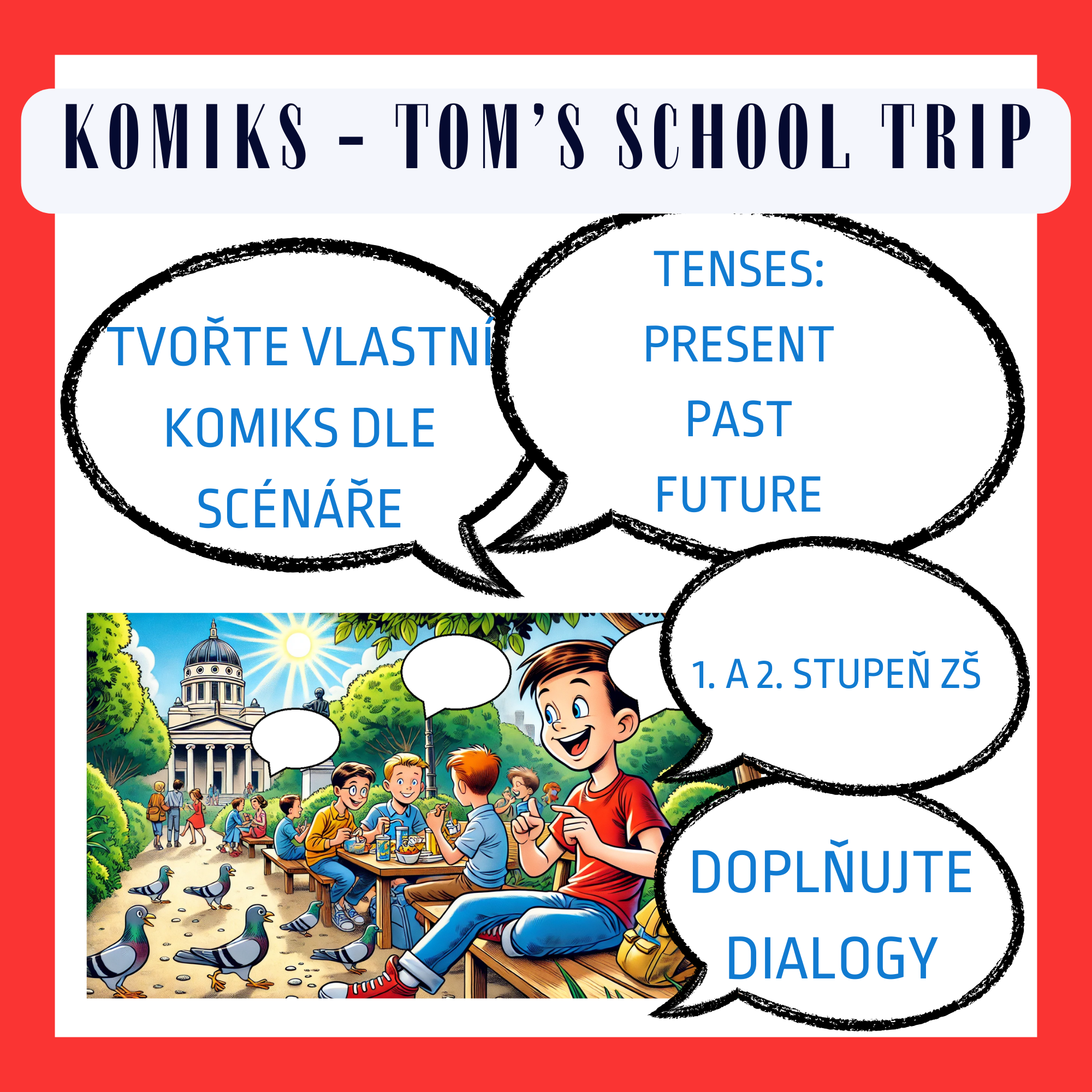 TVORBA KOMIXU - Tento materiál se zaměřuje na tvoření komiksu jako takového a na tvorbu dialogů či příběhu k daným komiksovým obrázkům čímž podněcuje ve studentech kreativitu. Hlavní hrdina Tom je zachycen v 5 situacích. U každého obrázku jsou prázdné bubliny, které studenti mohou dle kreativity doplňovat.