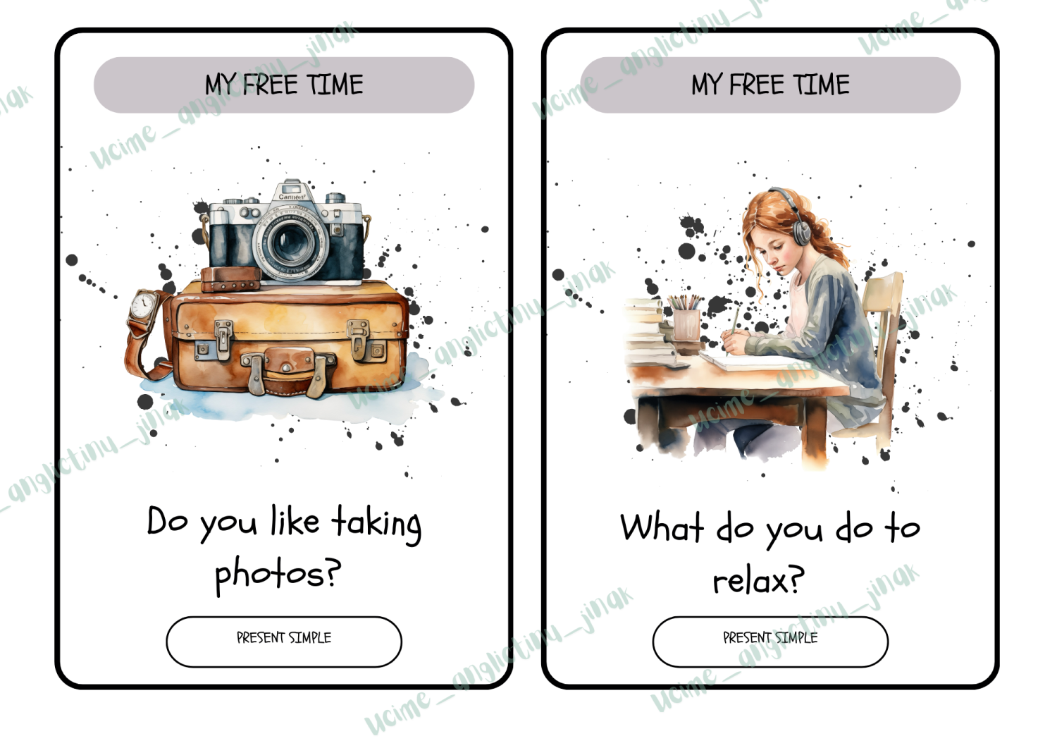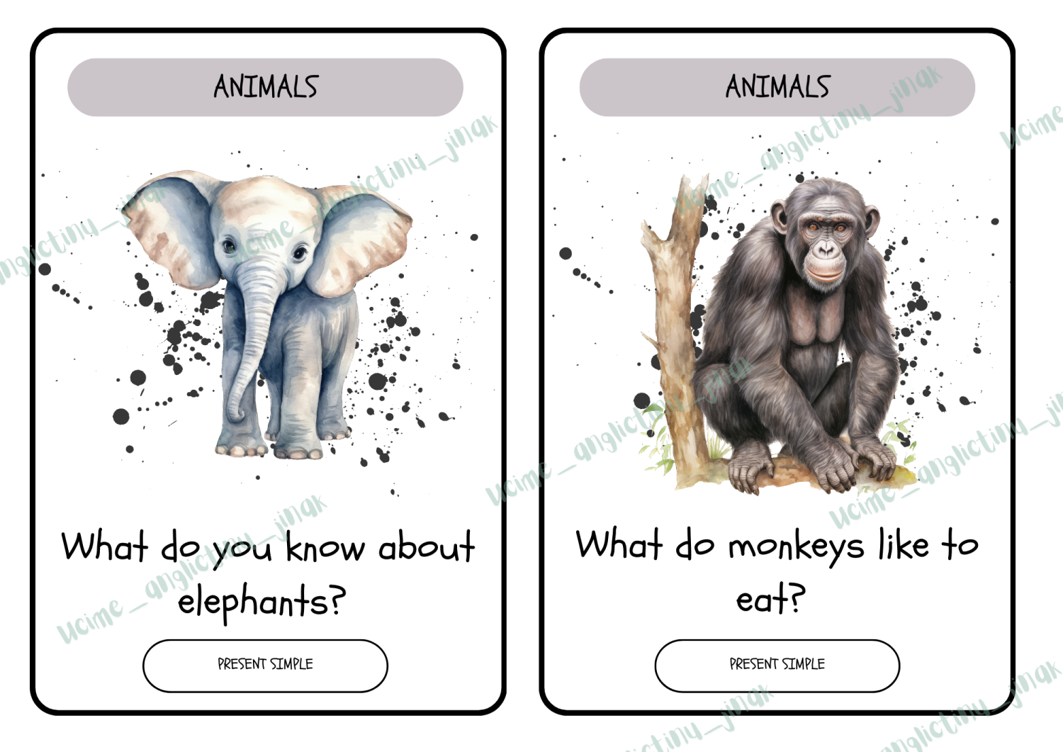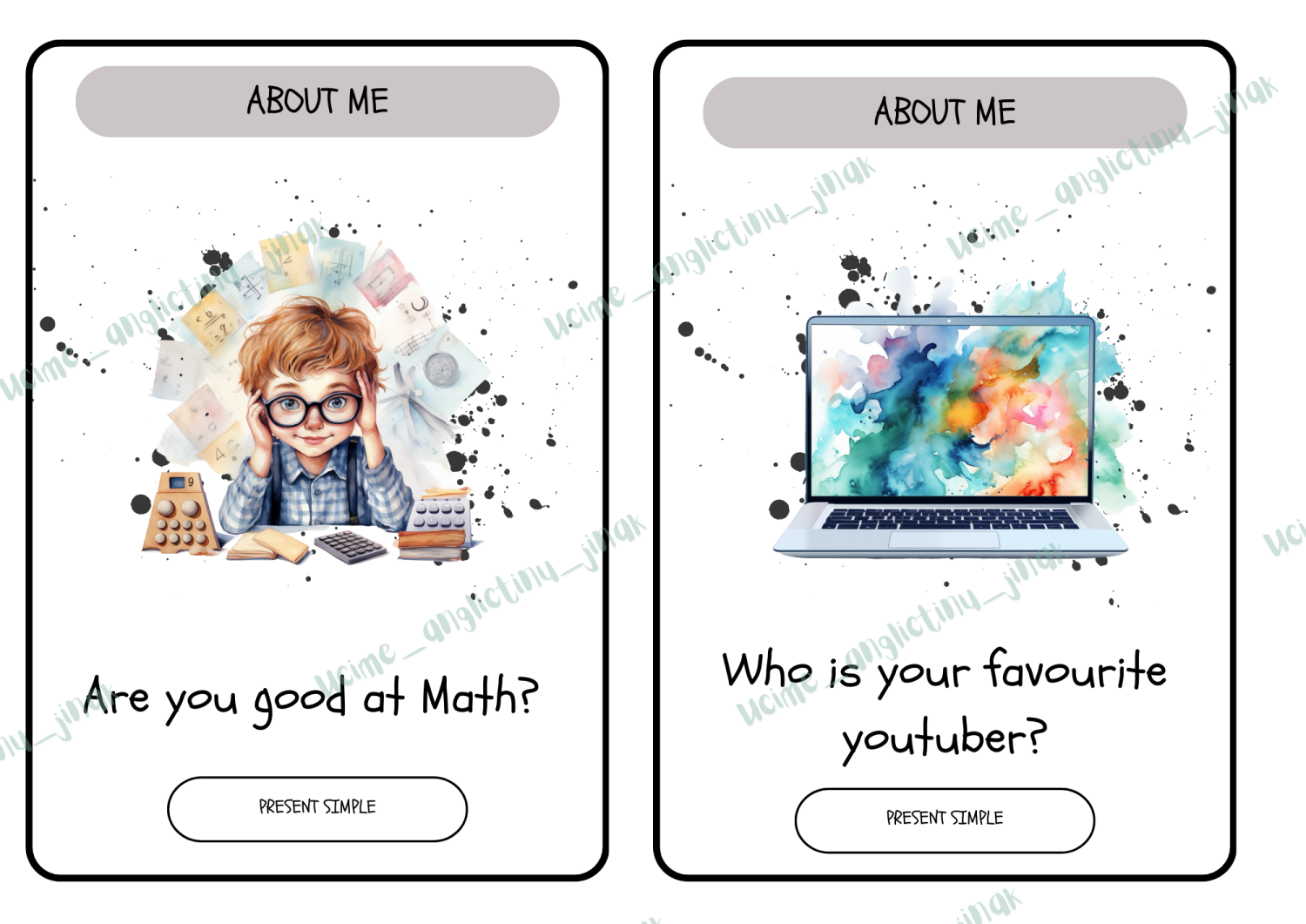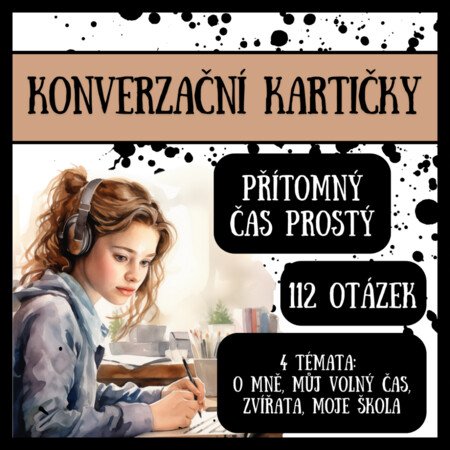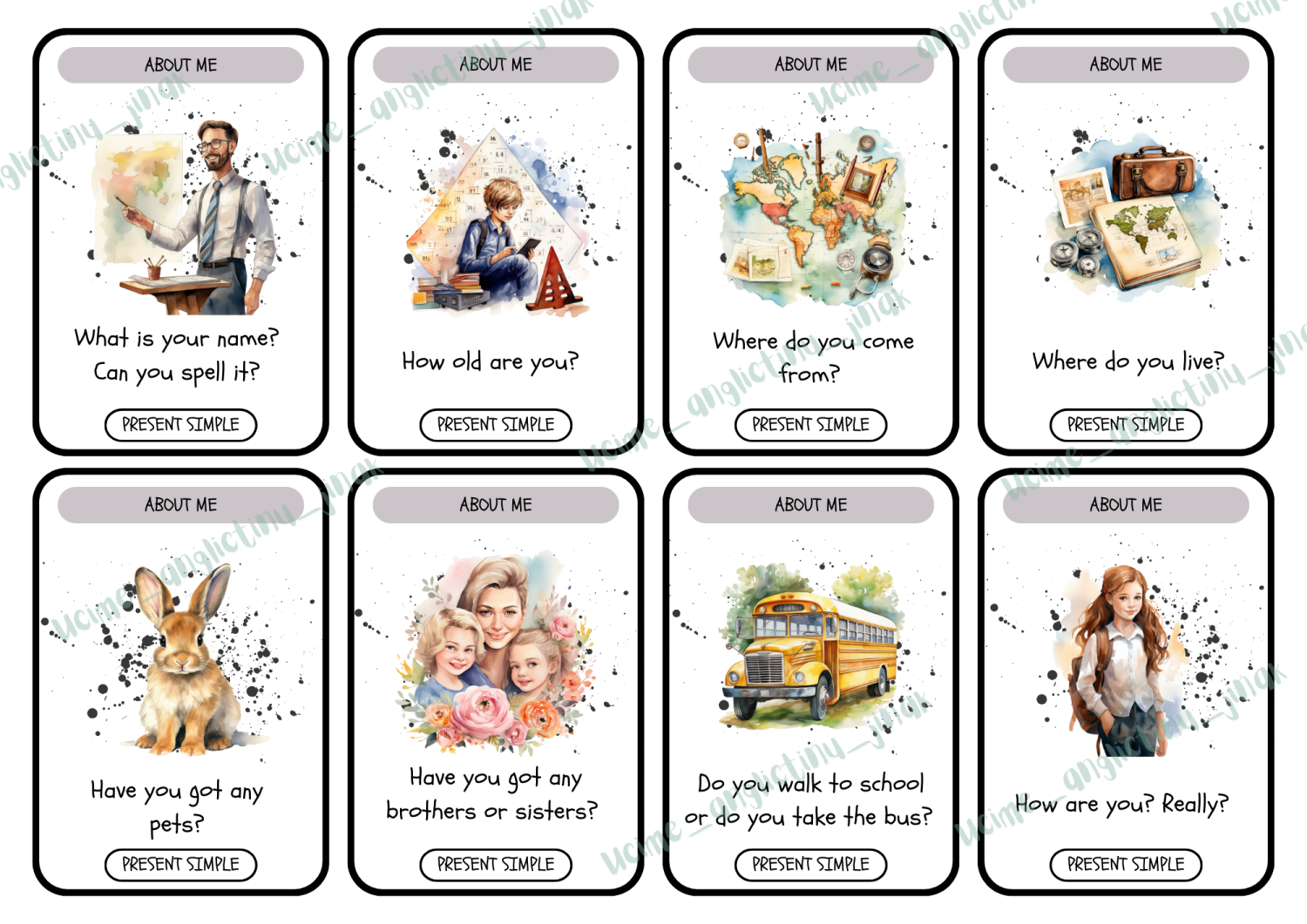 Tento materiál obsahuje 112 kartiček na úrovni A1-A2 a slouží k procvičení přítomného času prostého (present simple). Kartičky jsou rozděleny do 4 témat: