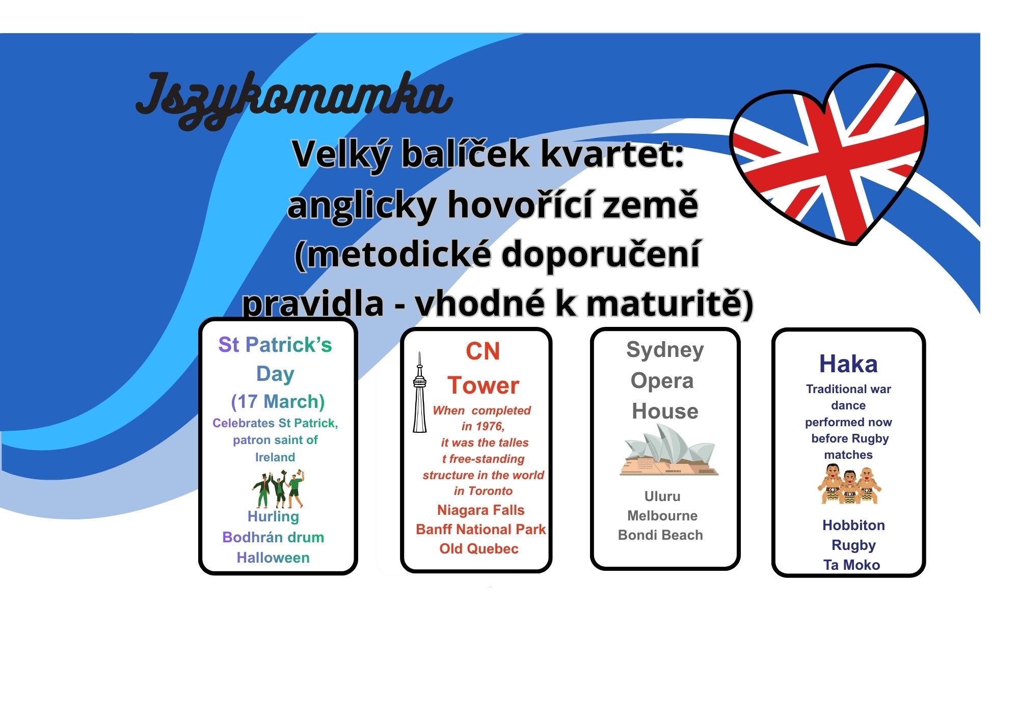 Materiál nabízí klasickou karetní hru (32 karet Irsko-Kanada, Austrálie-Nový Zéland) i zkrácené a didaktické varianty (16 karet) vhodné pro práci ve skupinách, rychlé aktivity nebo jako doplněk k maturitním tématům.