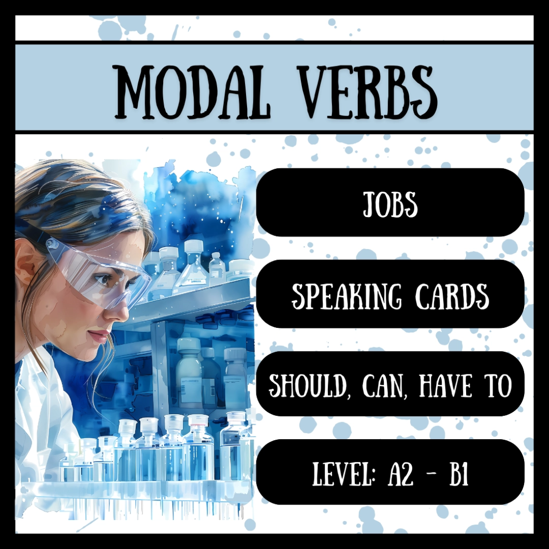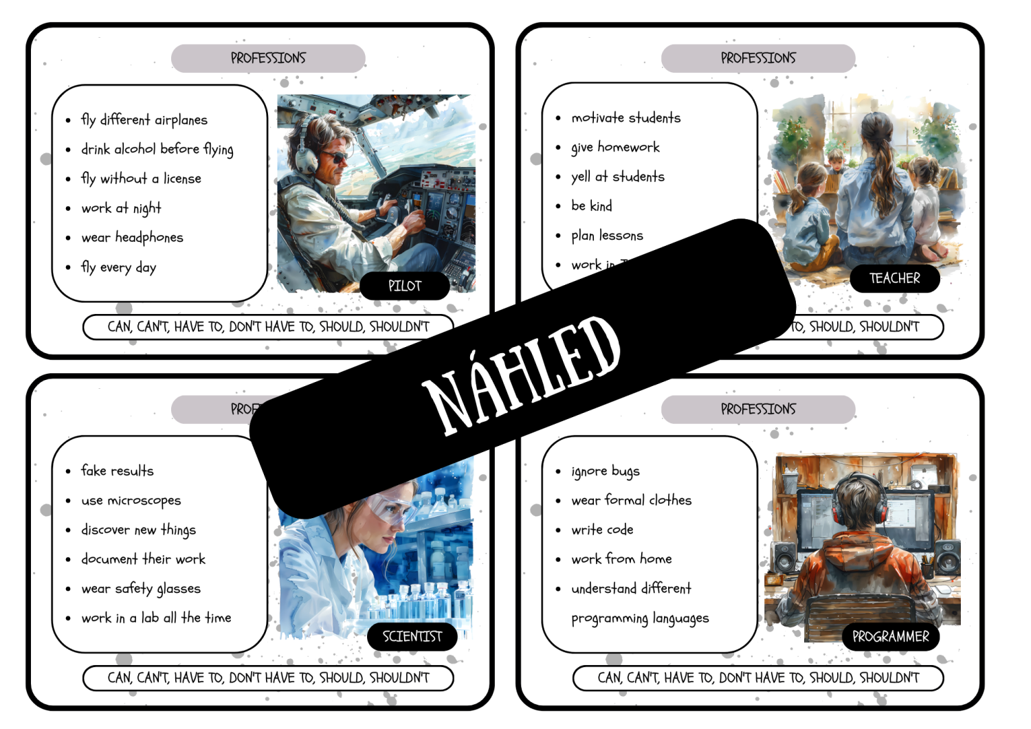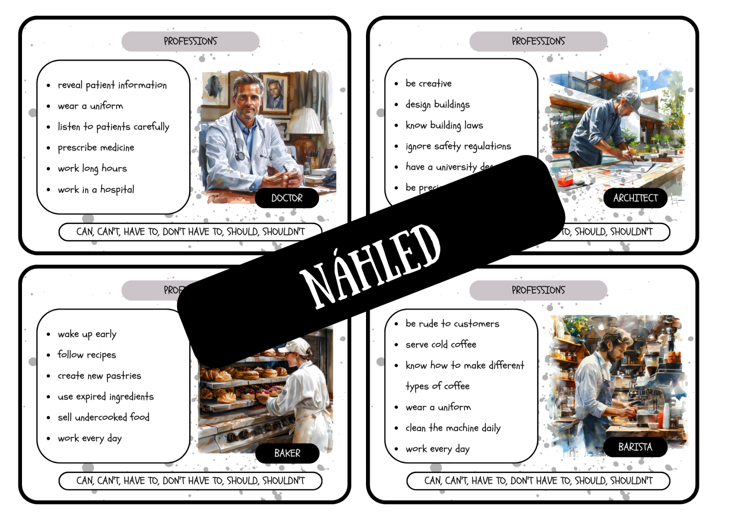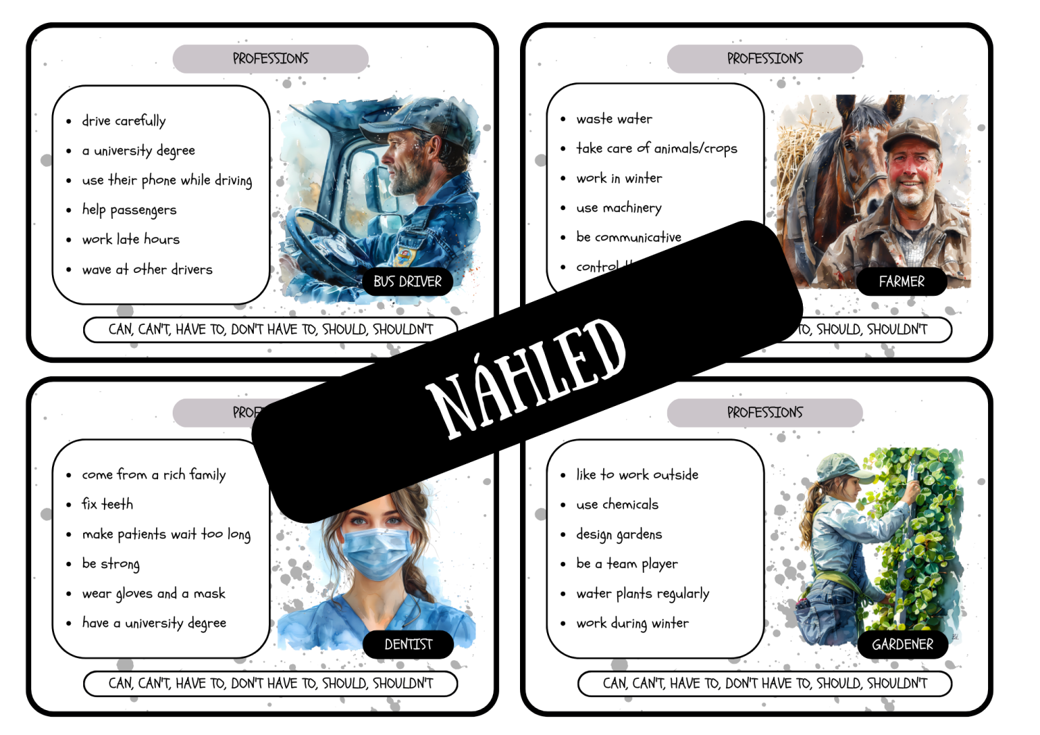 Kartičky vytiskněte, rozstříhejte a rozdejte studentům. Při popisu profesí by studenti měli využívat modální slovesa.