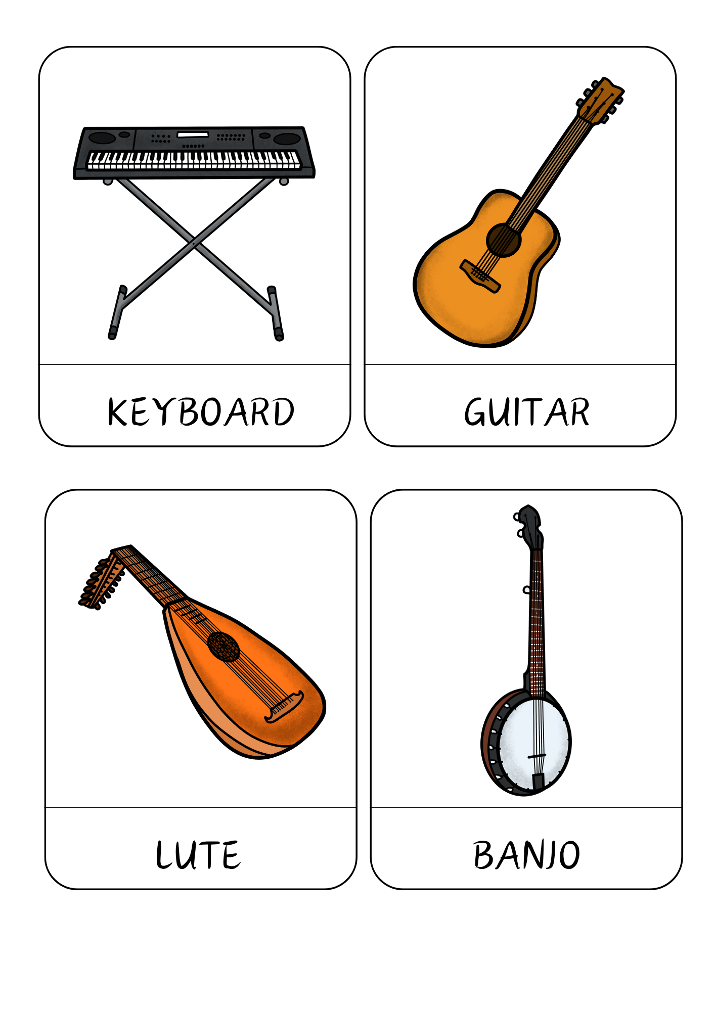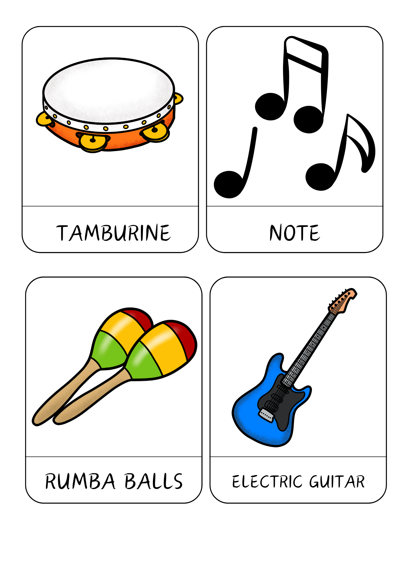 Materiál je zaměřen na rozvoj slovní zásoby v anglickém jazyce, zrakového vnímání a práce s pojmy z oblasti hudby. Děti se seznamují s názvy hudebních nástrojů a hudebních symbolů prostřednictvím přehledných obrázků a třísložkových karet.