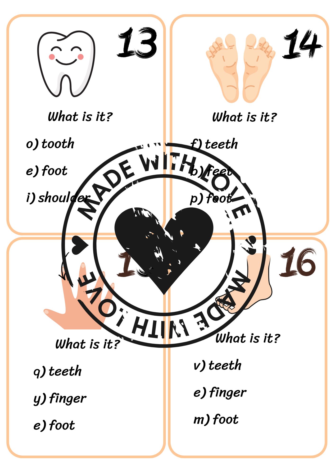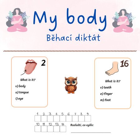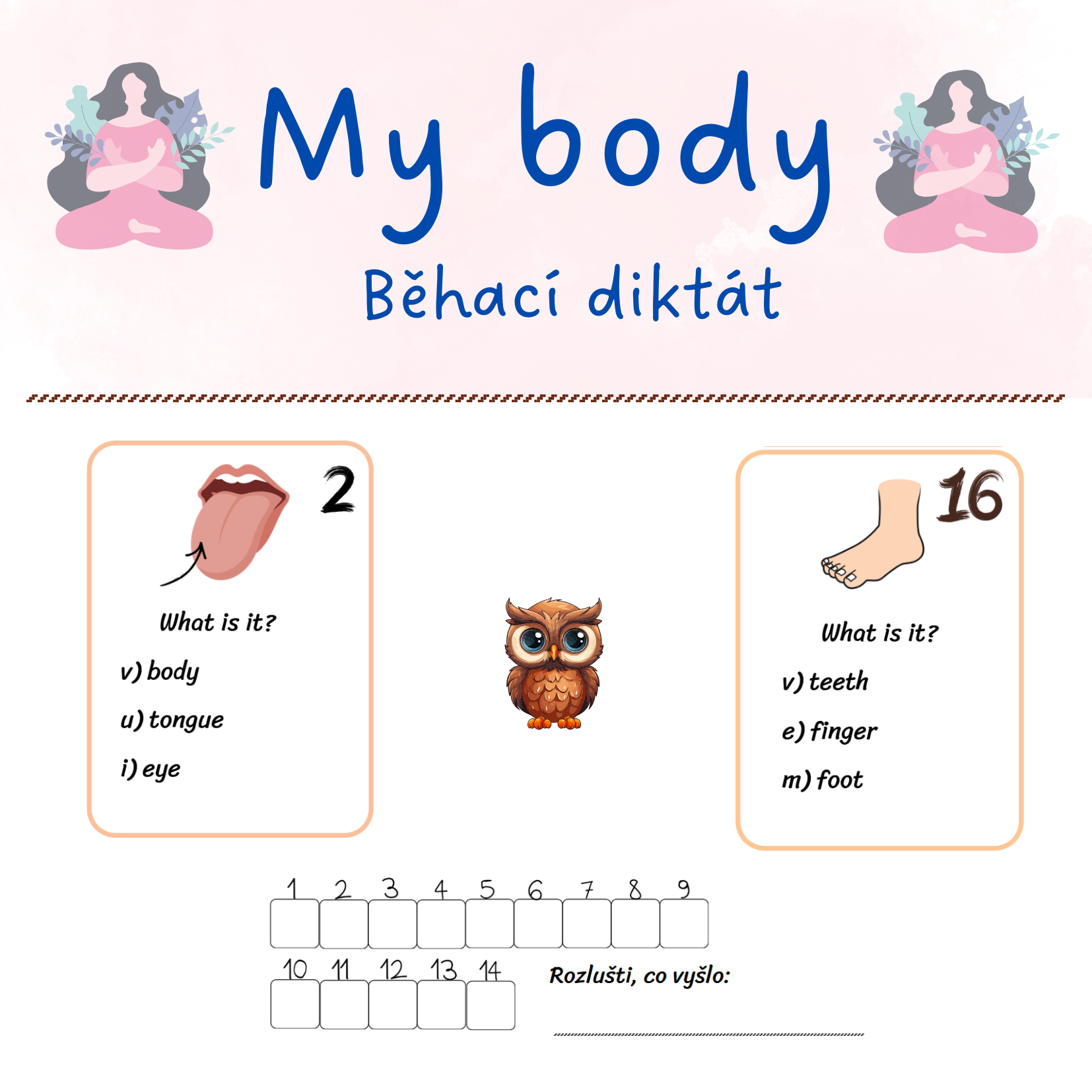Běhací diktát na téma My body, včetně záznamového archu. Aktivita je vhodná pro výuku angličtiny, rozvíjí slovní zásobu, čtení, psaní i pohyb.