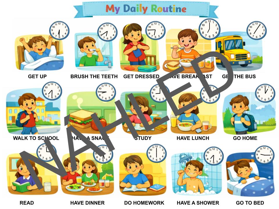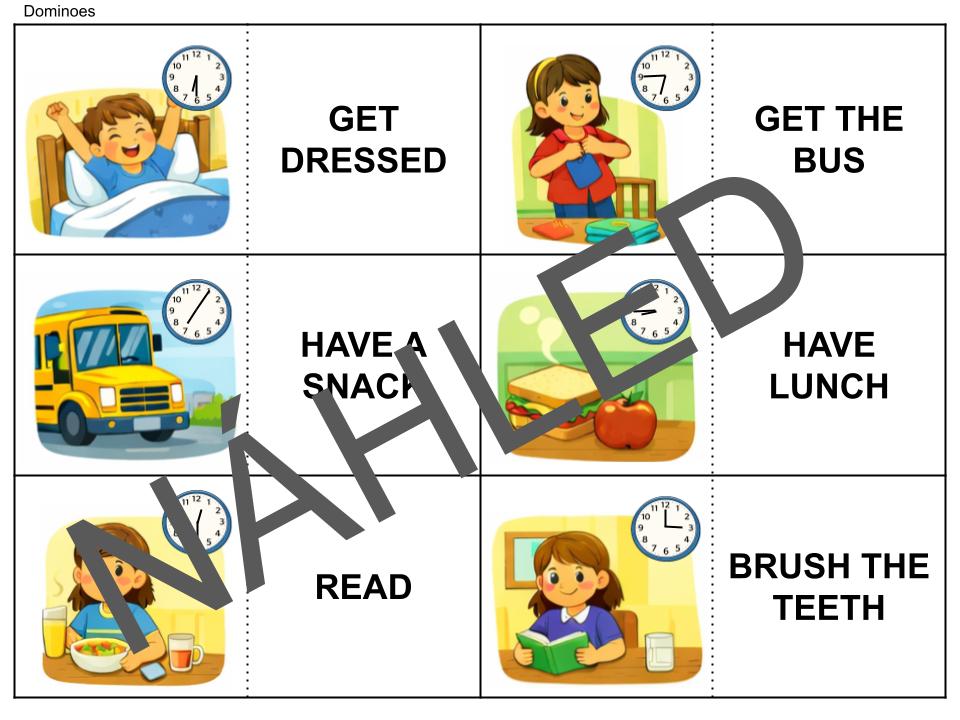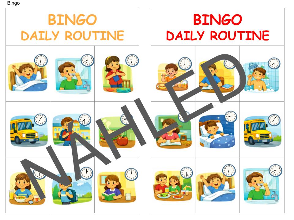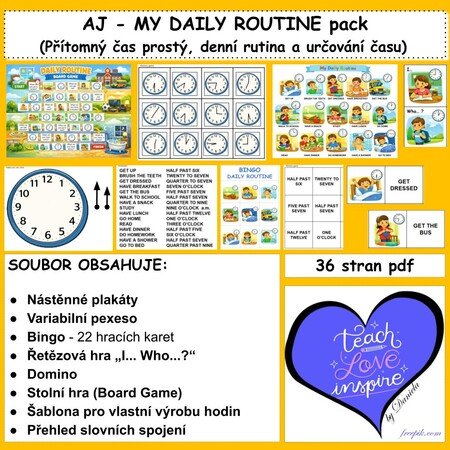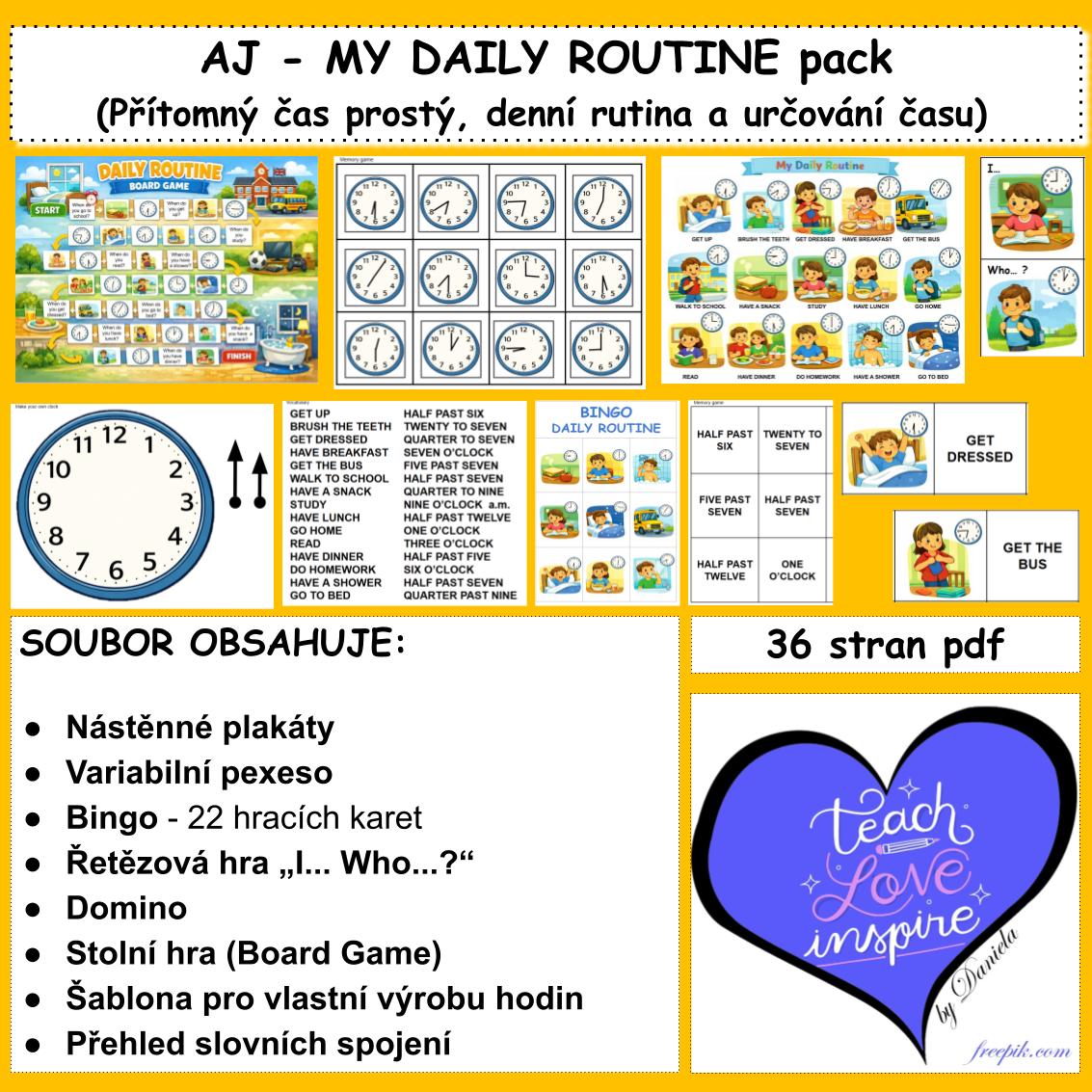 Balíček My Daily Routine pack (AJ, 1. st. ZŠ): 36 stran PDF, 8 aktivit. Obsahuje Bingo (22 karet), pexeso, domino, stolní hru, řetězovku, plakáty, výrobu hodin a slovníček. Hravé procvičení denního režimu a času v angličtině.