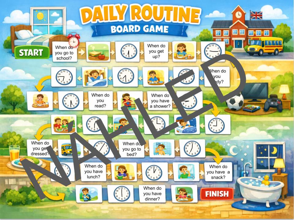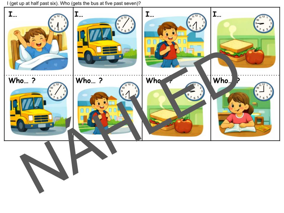 ◦ Stolní hra (Board Game): Herní plán s obrázky nebo otázkami typu „When do you have lunch?“ pro praktickou konverzaci.