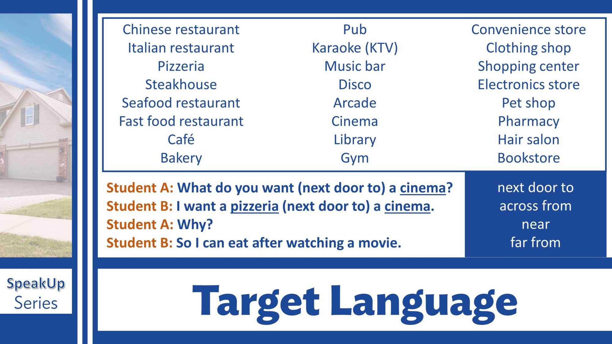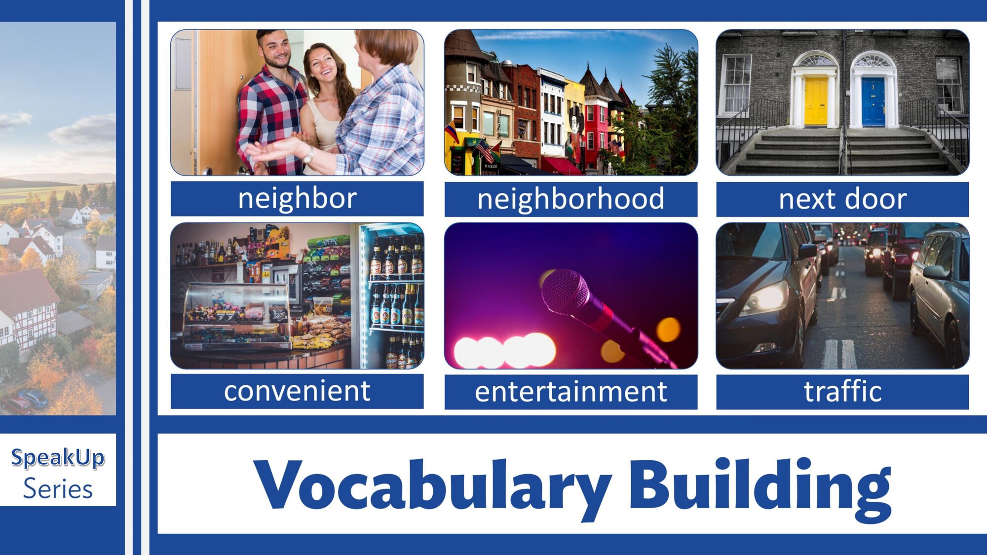 Materiál je součástí série SpeakUp zaměřený na téma sousedství (neighborhood) v angličtině. Rozvíjí slovní zásobu a komunikační dovednosti žáků prostřednictvím řízených diskusí, párových aktivit a modelových dialogů. Téma je blízké každodennímu životu, takže podporuje přirozené vyjadřování a osobní zapojení žáků.