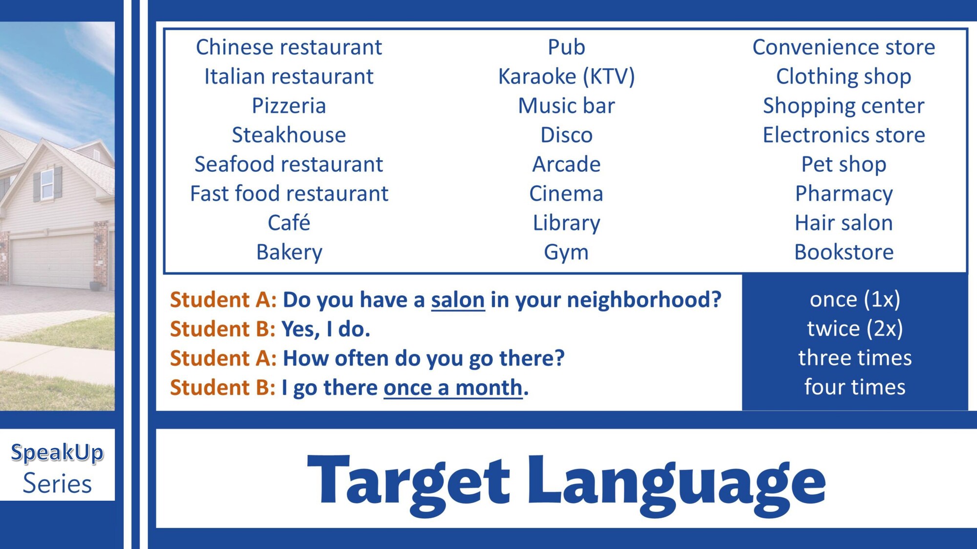 - modelové dialogy s cílovým jazykem (Target Language) - procvičování frekvence (once, twice, three times…) a předložek místa (next to, near, far from…)