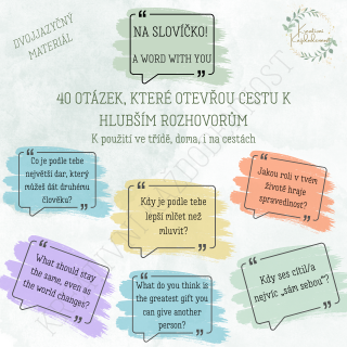 Chtěla jsem vytvořit materiál, který žákům i studentům umožní mluvit o věcech, na které v běžných rozhovorech často nezbývá prostor. Otázky, které jim pomohou vyjádřit vlastní názory, zamyslet se a přitom se navzájem lépe poznat. Tak vznikl materiál Na slovíčko - 40 konverzačních otázek v češtině i angličtině, které dokážou proměnit běžnou konverzaci ve smysluplný rozhovor a podporují naslouchání i vzájemné porozumění.