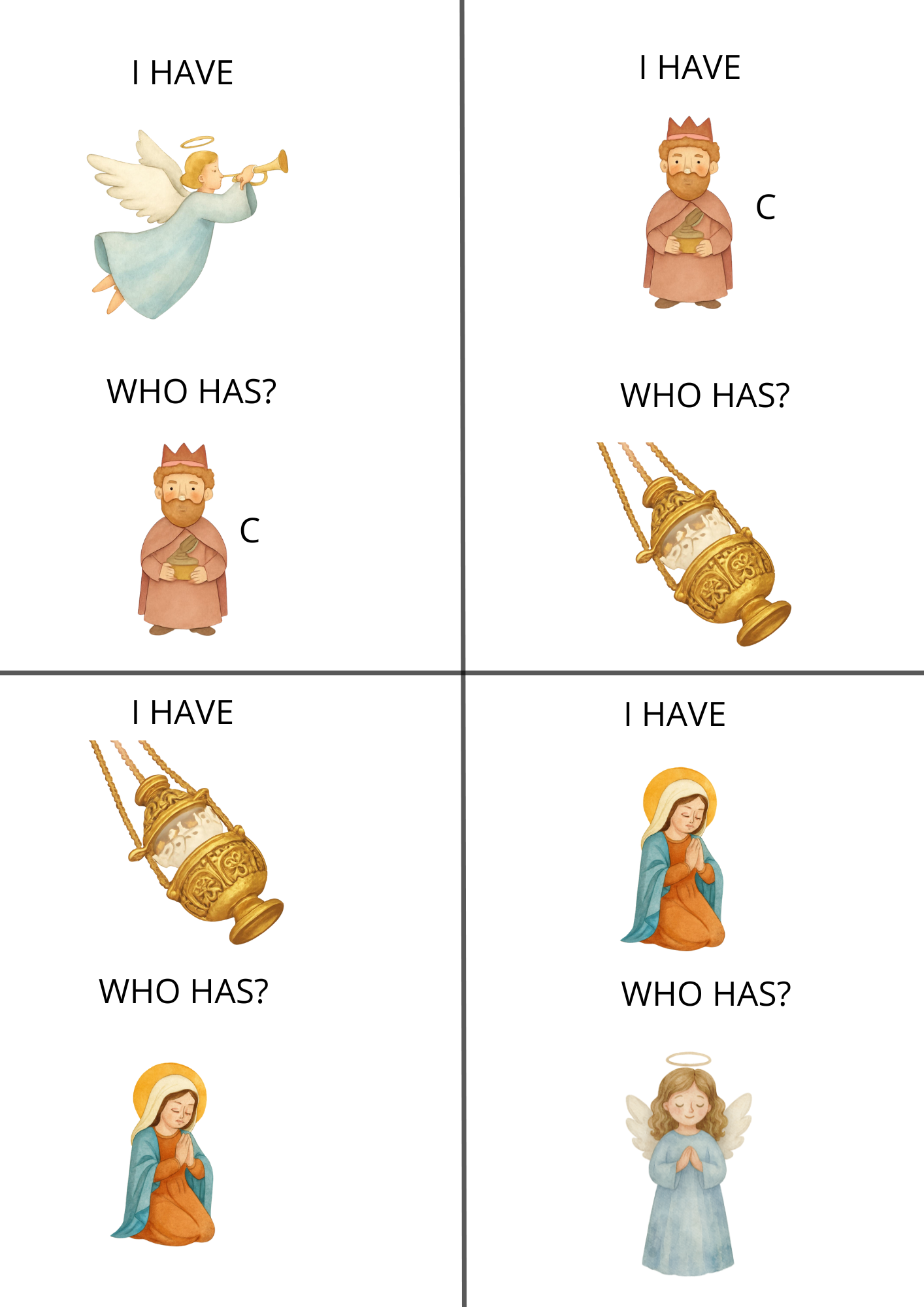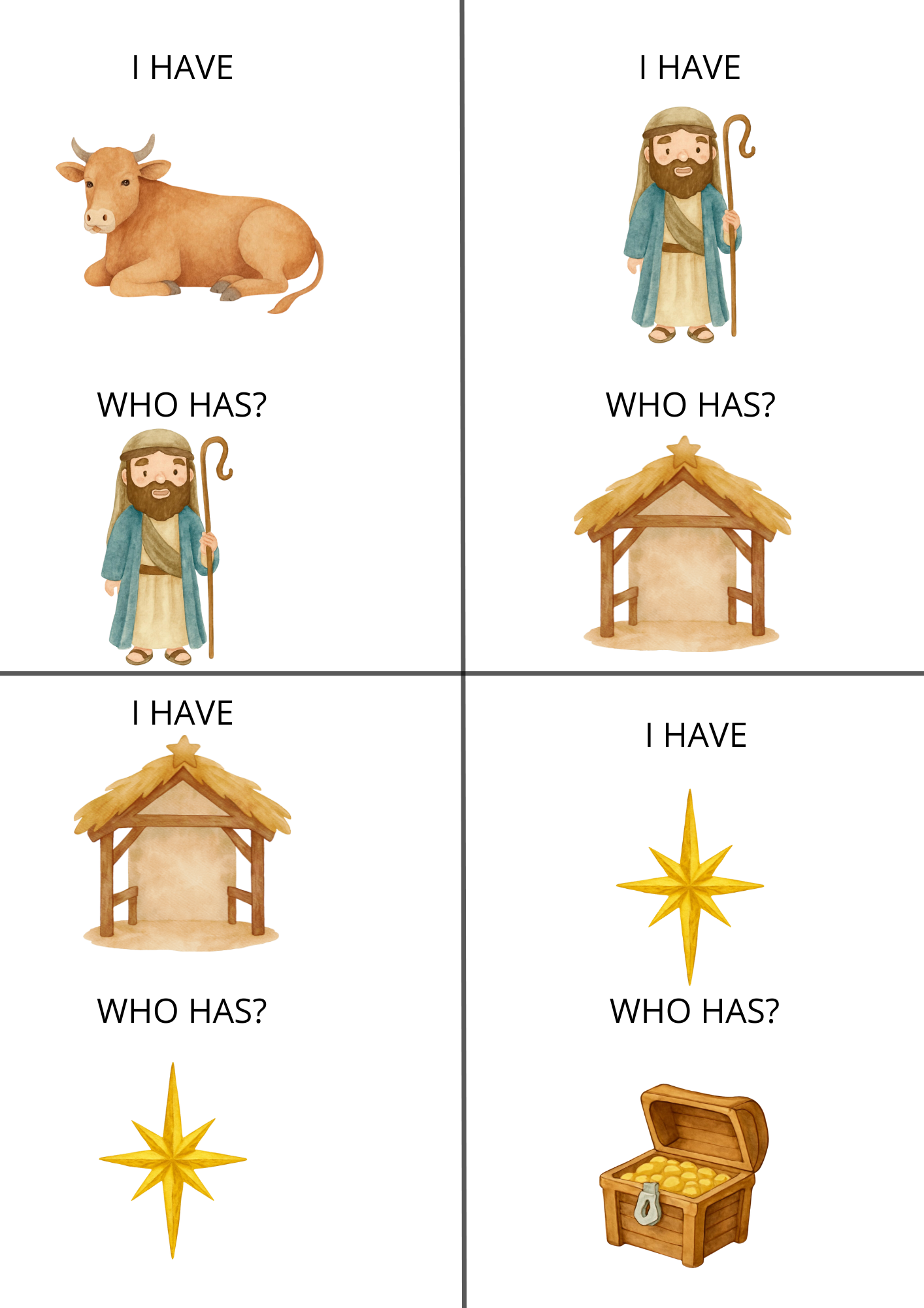 Soubor obsahuje 18 kartiček ke hře „Já mám, kdo má?“ v českém jazyce s tématem betlém. Kartičky jsou určeny pro práci ve