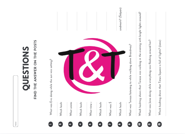 - 2 pracovní listy (24 otázek - otevřené a uzavřené) k jednotlivým postům - žáci procvičují čtení s porozuměním, vyhledávají hashtagy a odpovědi na otázky (z postů nebo kartiček)