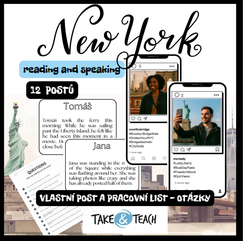 Čtení s porozuměním z výletu do New Yorku. Materiál seznamuje s nejznámějšími místy v NY a procvičuje gramatické časy (minulý čas prostý, průběhový, předpřítomný čas). 12 postů s fotografiemi památek + popisem výletu + pracovní list.