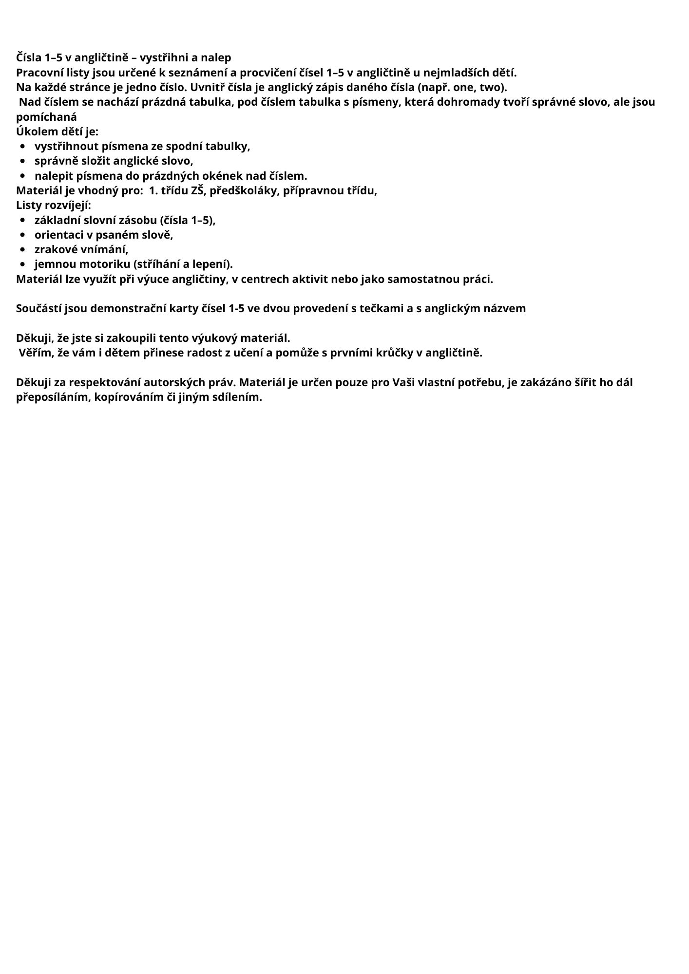 Součástí jsou demonstrační karty čísel 1-5 ve dvou provedení s tečkami a s anglickým názvem