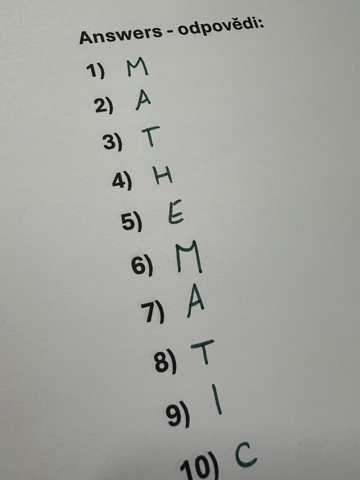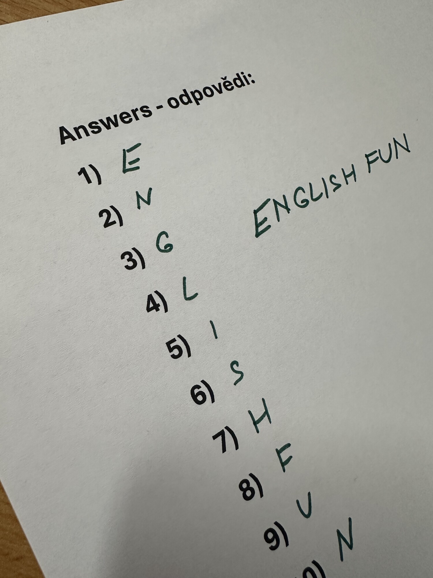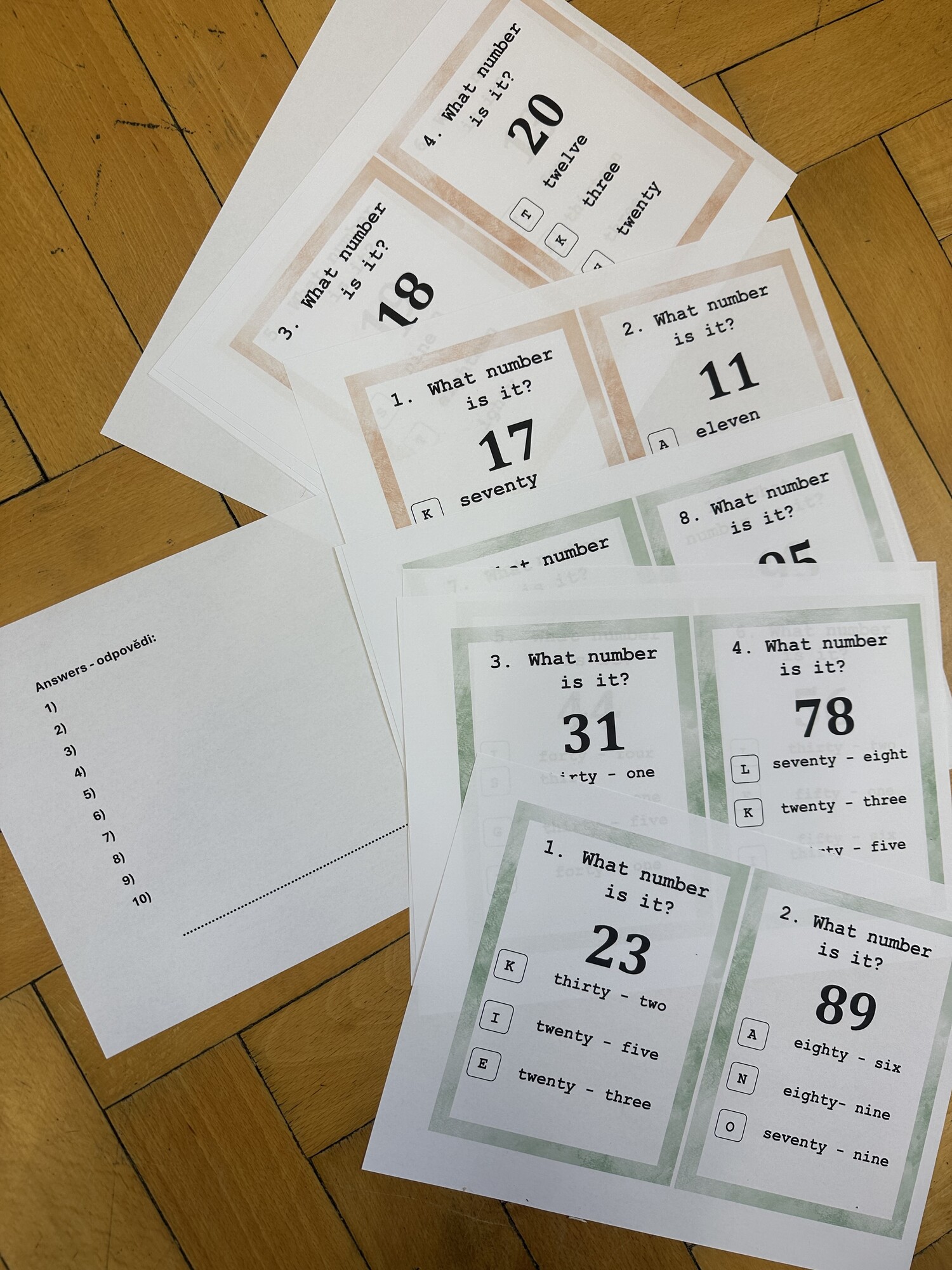 Otázky jsou očíslované. U každé možnosti je velké tiskací písmeno – děti vyberou správnou odpověď a zapíší příslušné písmeno k očíslované otázce. Správné řešení kvízu 1 – 10 (modrý okraj) je COUNT TO TEN, 1 – 20 (oranžový okraj) je MATHEMATICS, 1 – 100 (zelený okraj) je ENGLISH FUN.