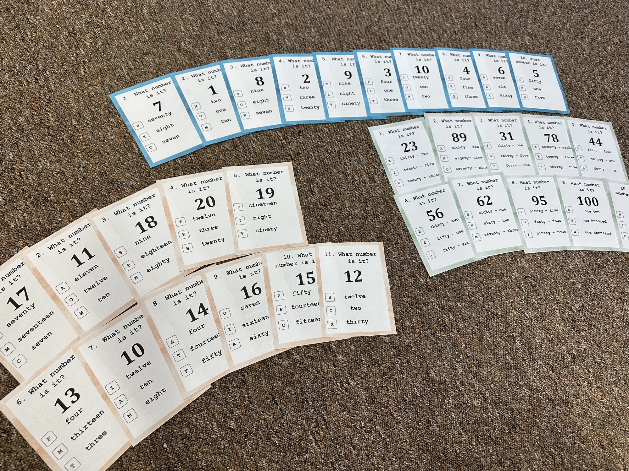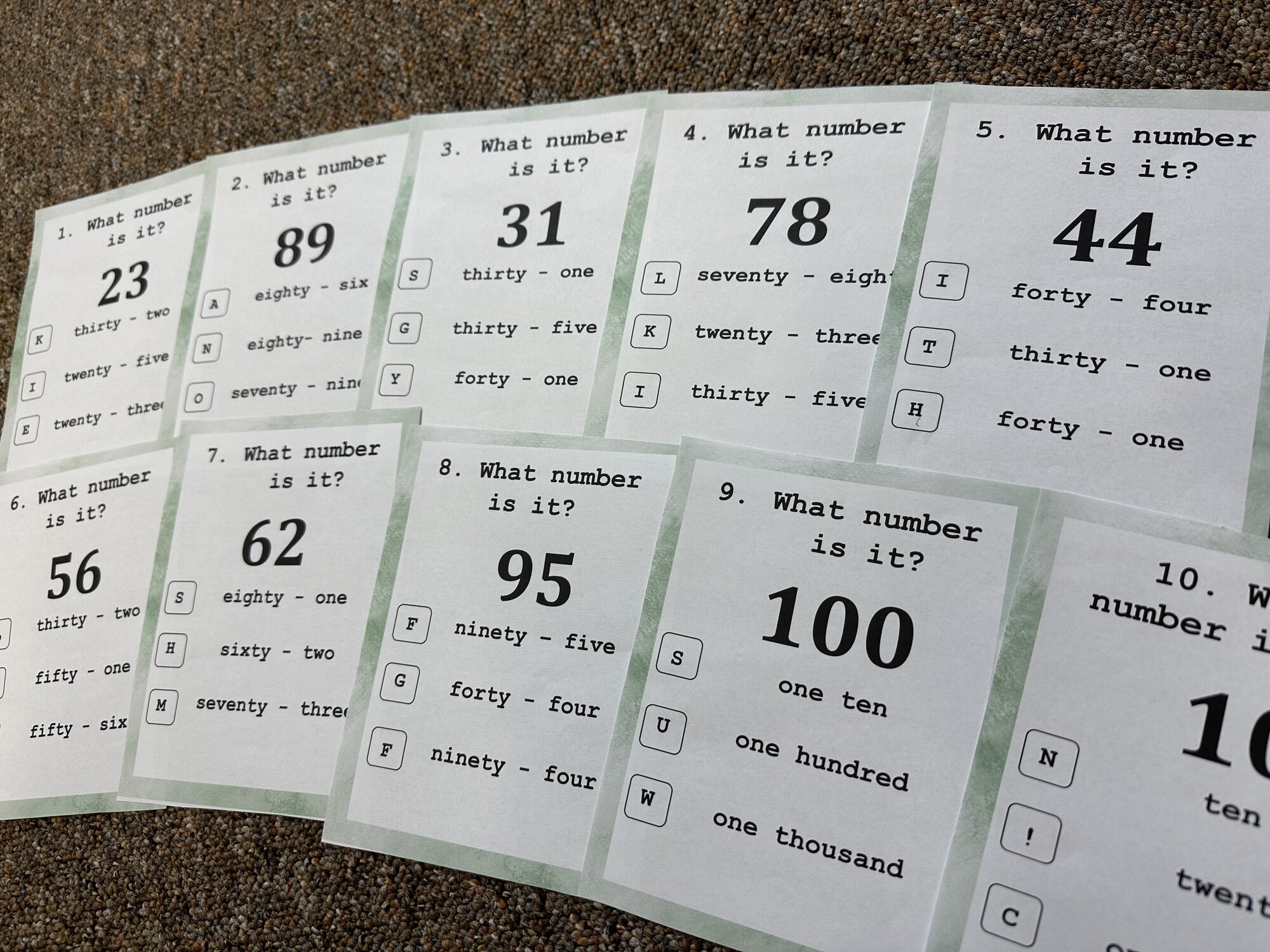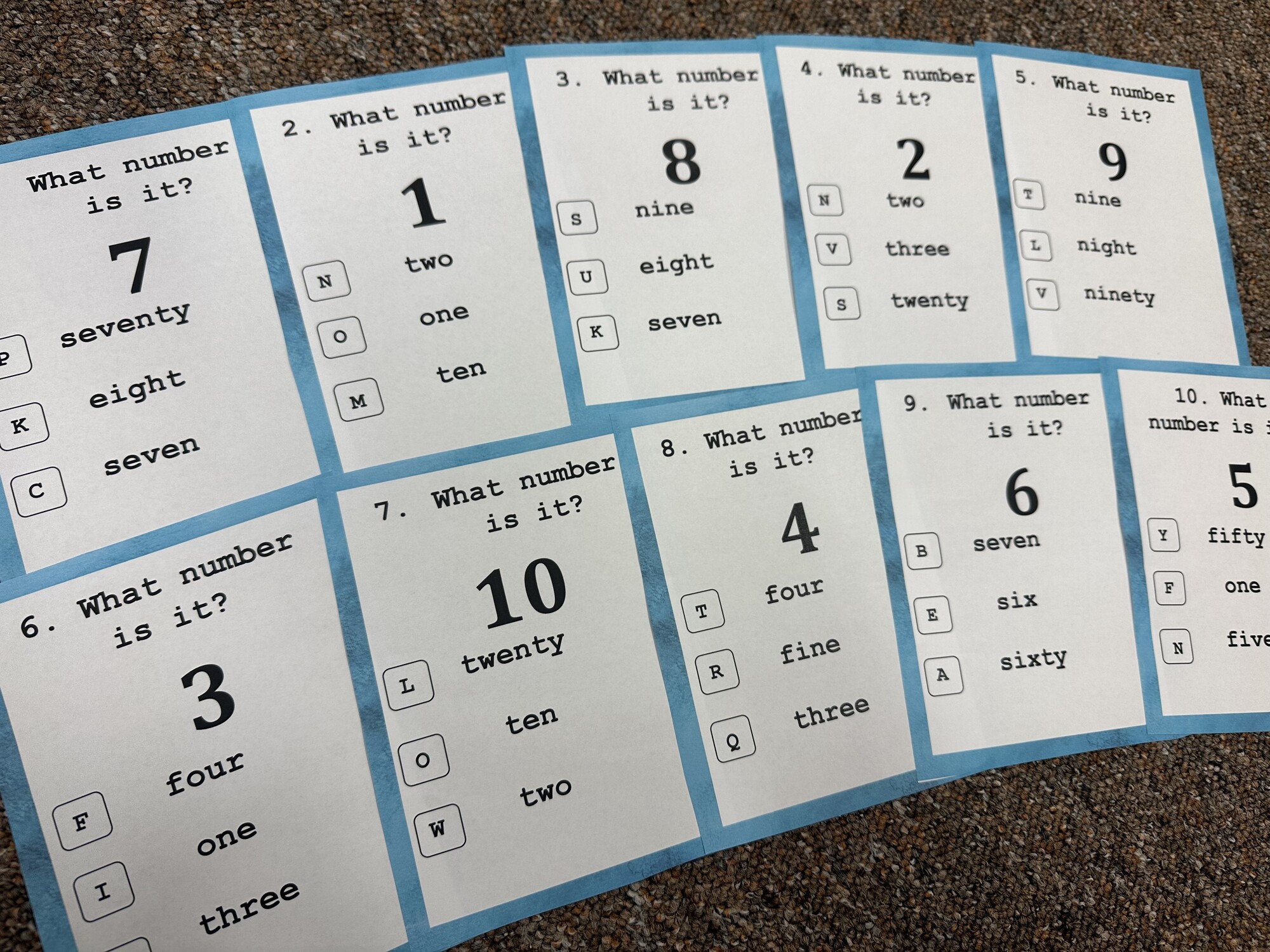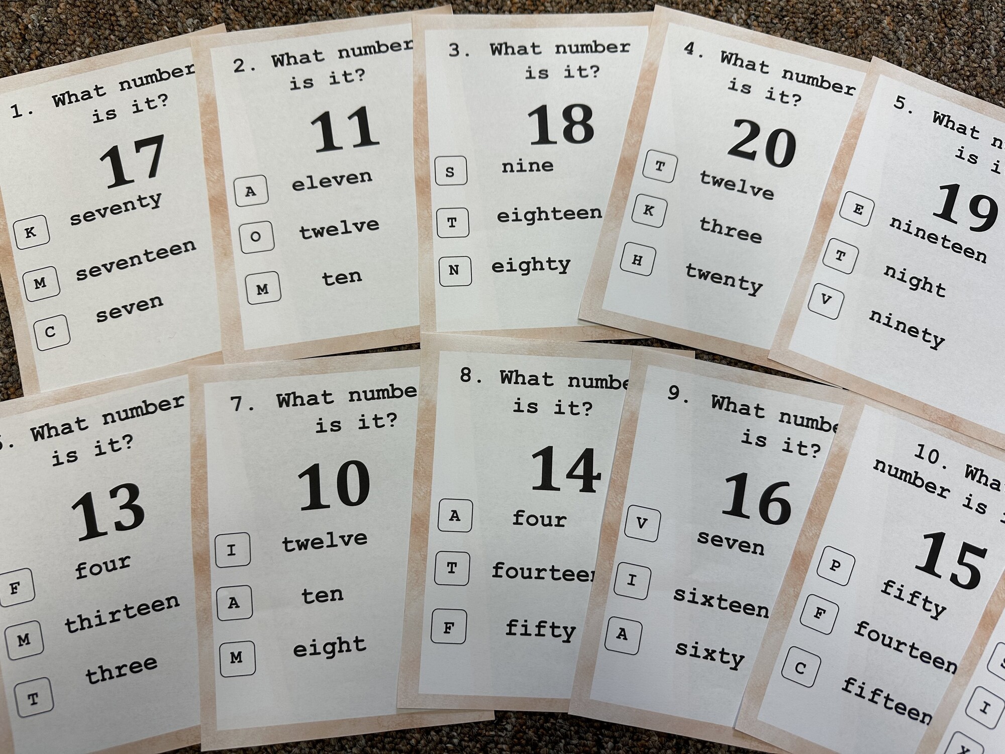 Otázky jsou očíslované. U každé možnosti je velké tiskací písmeno – děti vyberou správnou odpověď a zapíší příslušné písmeno k očíslované otázce. Správné řešení kvízu 1 – 10 (modrý okraj) je COUNT TO TEN, 1 – 20 (oranžový okraj) je MATHEMATICS, 1 – 100 (zelený okraj) je ENGLISH FUN.