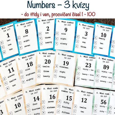 Materiál obsahuje 19 A4 stran – 3 kvízy (čísla 1 – 10, 1 – 20, 1 – 100). Obsahuje karty s otázkami barevně rozlišené a list k zápisu odpovědí. Otázky si můžete číst s dětmi ve třídě nebo můžete rozmístit zalaminované karty venku na zahradě, na stromy, pod kameny, vyznačit dětem trasu procházky s úkoly.
