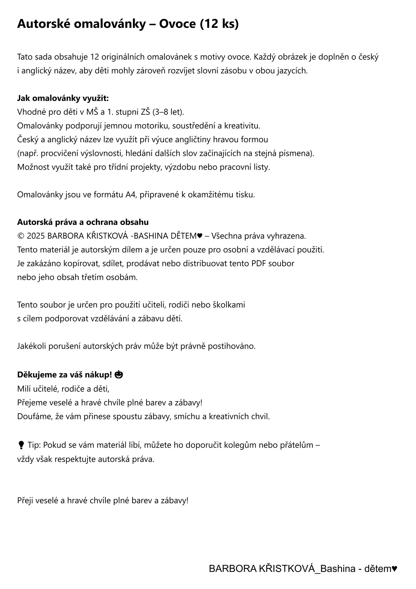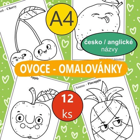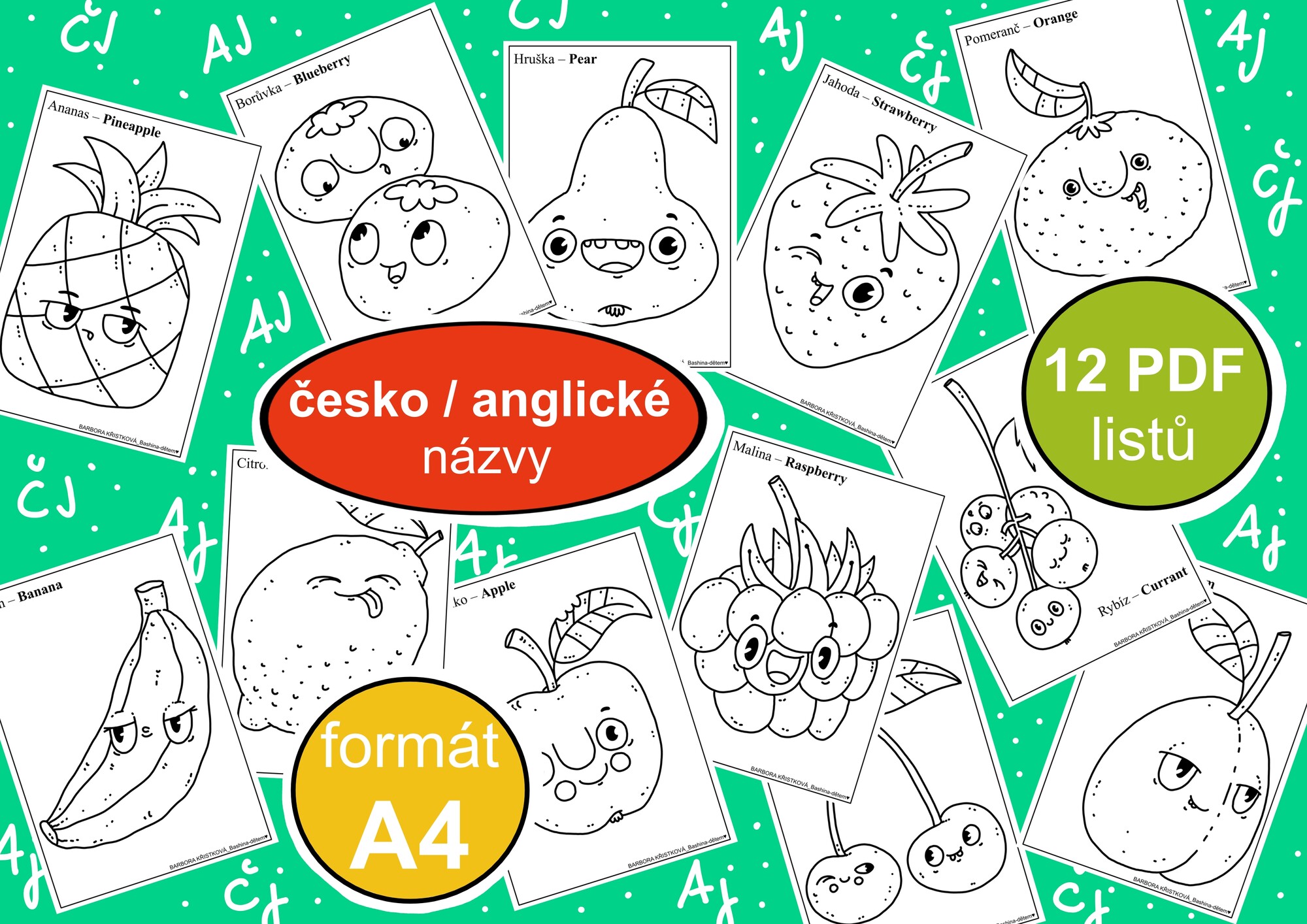 Sada 12 originálních omalovánek s motivy ovoce je ideální pro mateřské školy a 1. stupeň ZŠ. Každý obrázek je doplněn o český i anglický název, takže děti při tvoření zároveň přirozeně rozšiřují slovní zásobu.
