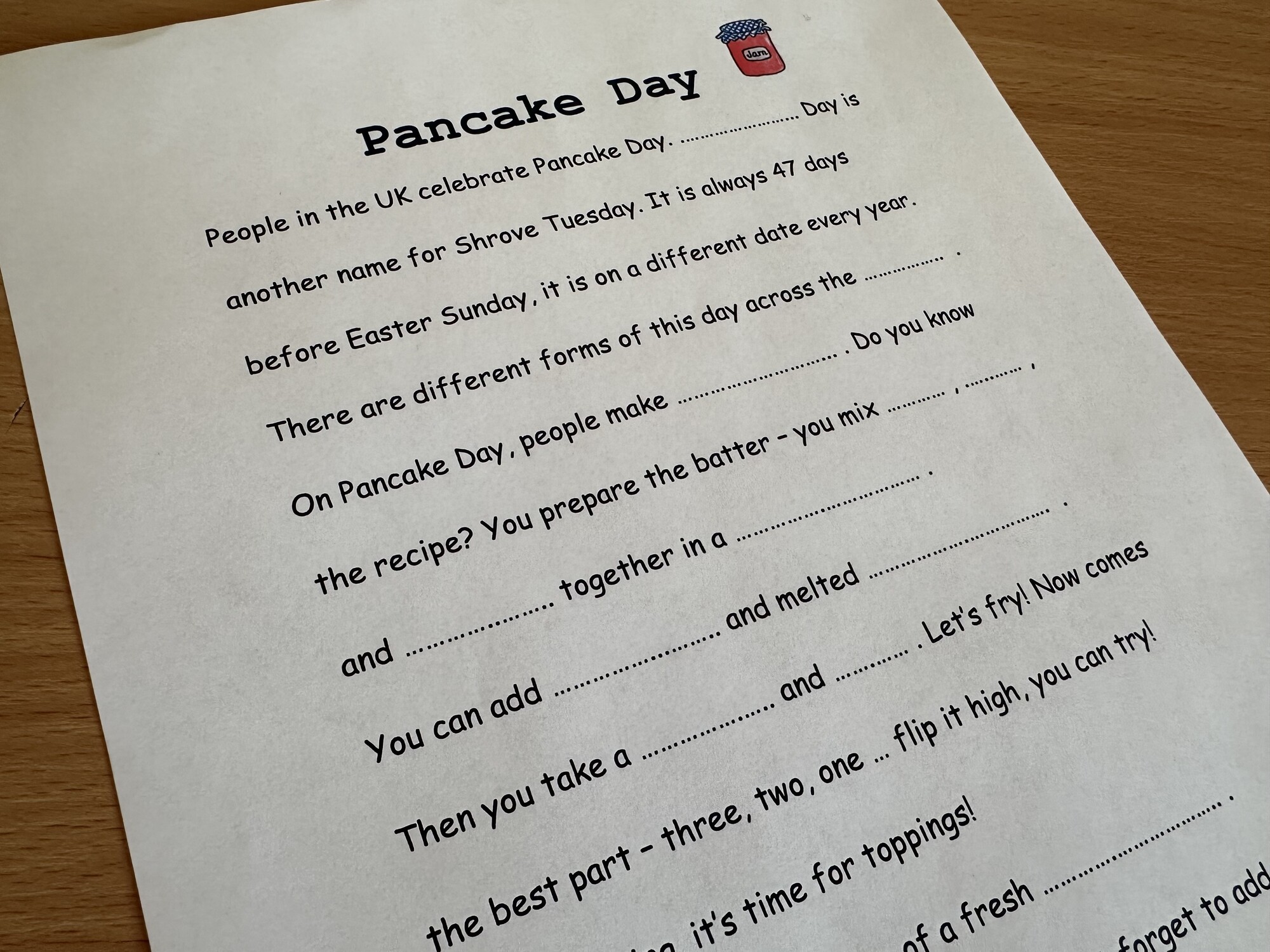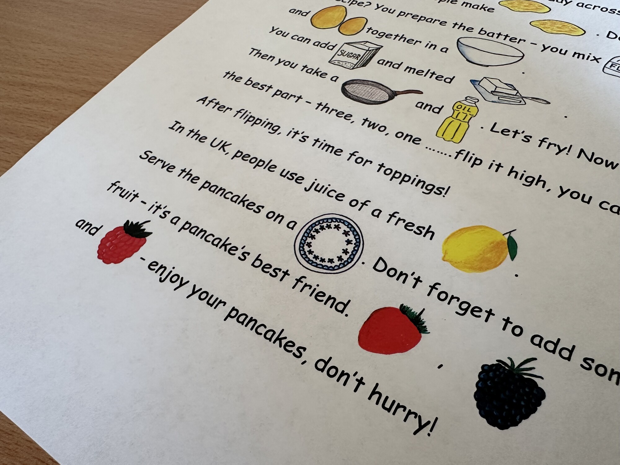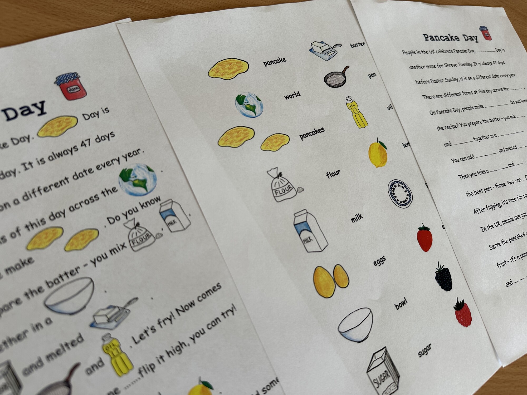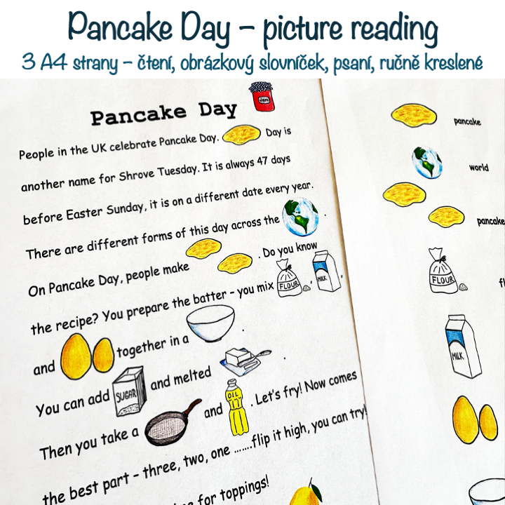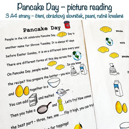 Materiál obsahuje 3 A4 strany – text ke čtení na téma Pancake Day, obrázkový slovníček, text k procvičení psaní. Materiál může sloužit dětem k inspiraci – děti po přečtení mohou tvořit vlastní texty s obrázky.