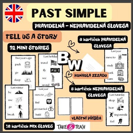 Nechte žáky převyprávět krátké příběhy s pomocí předdefinovaných kartiček. Vhodné ke konverzaci, psaní příběhu, běhacímu diktátu. Nebo nechte žáky vytvořit jejich vlastní krátký příběh. Černobílá verze ihned k použití.