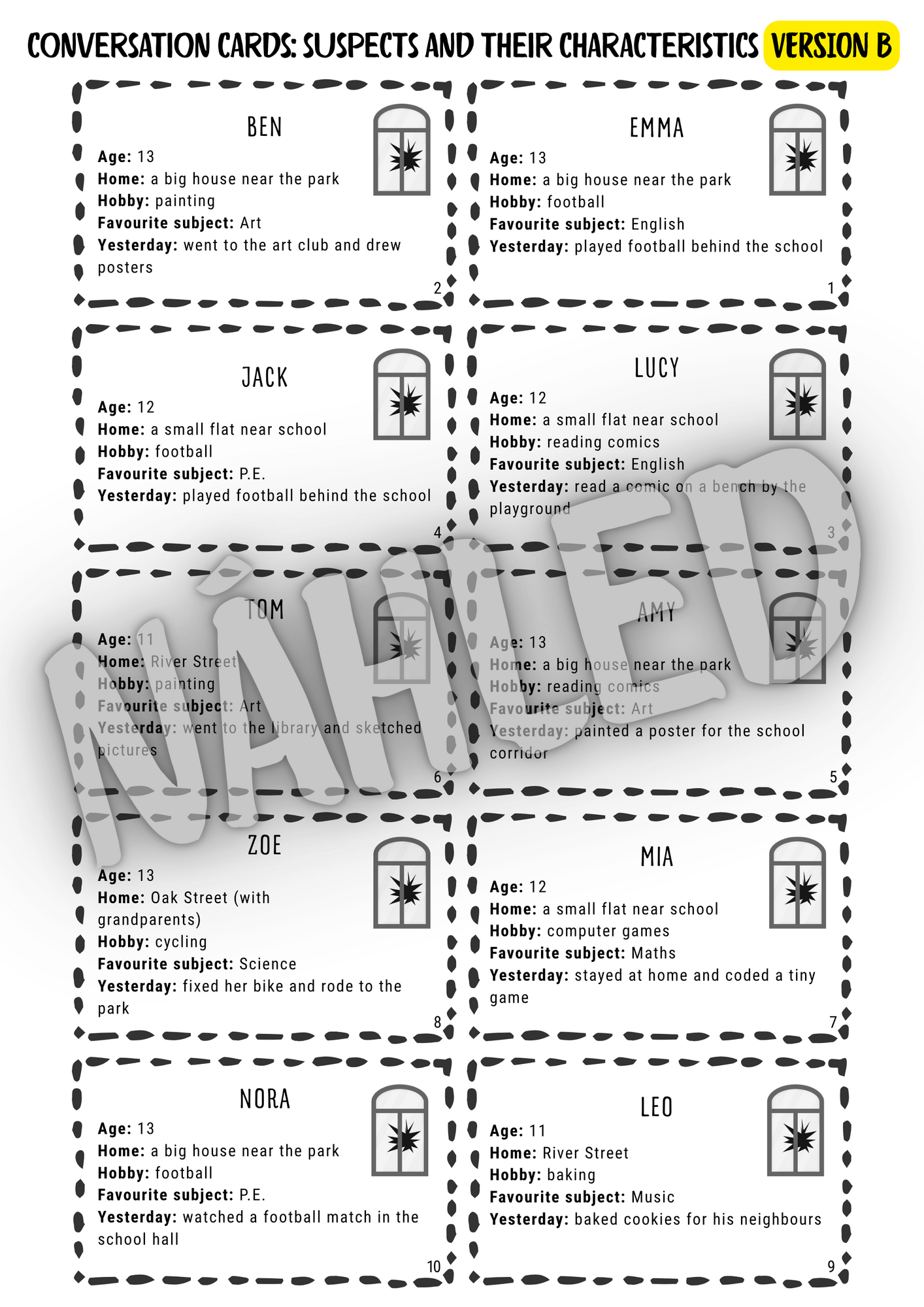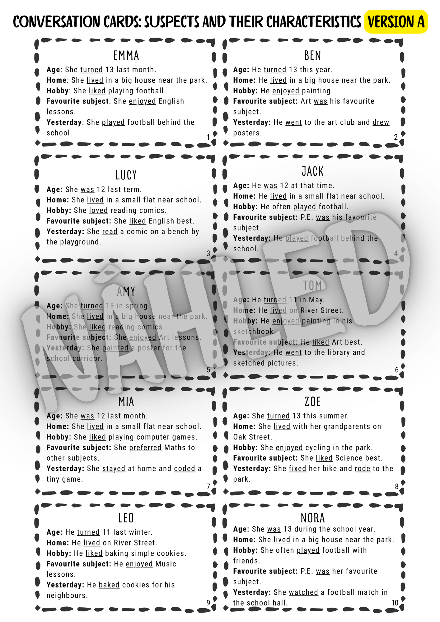 - verze A: na každé kartě je jméno podezřelého a 5 vět v minulém čase, každá s uvedenou kategorií: Age / Home / Hobby / Favourite subject / Yesterday