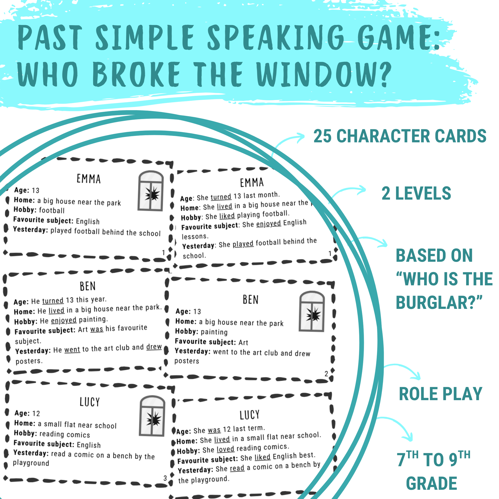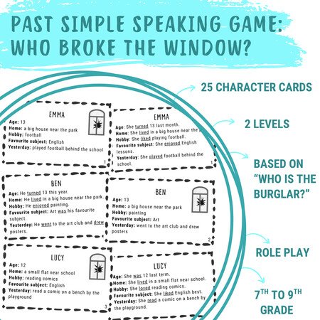 Zábavná konverzační detektivka do hodin anglického jazyka. Žáci se stávají různými postavami, ptají se v minulém čase a podle indicií odhalují viníka, který ve třídě rozbil okno.