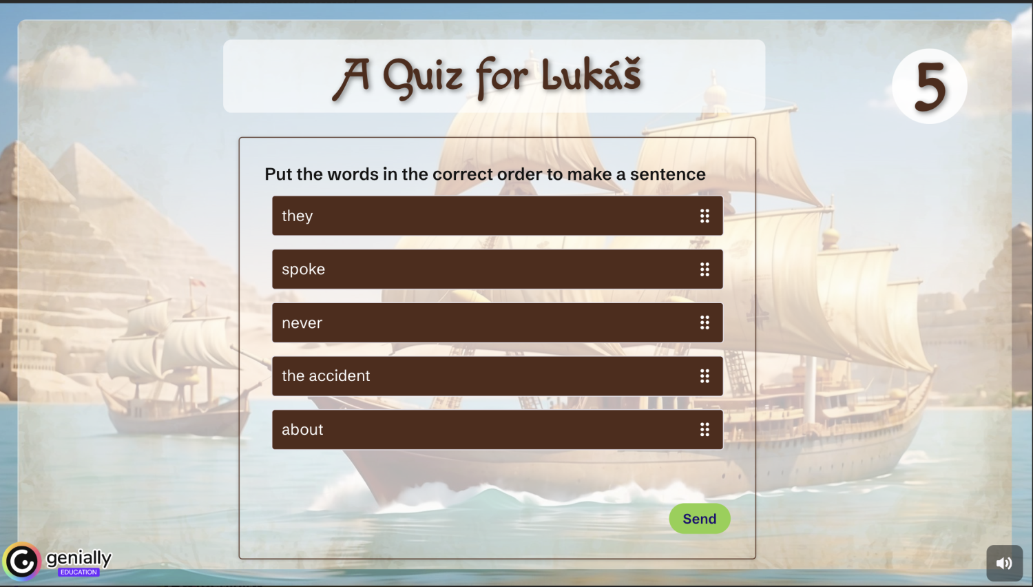- Kvíz - 15 otázek/vět - procvičování správného slovosledu ve větě. Žák musí správně přetáhnout slova od shora dolů, aby věty dávaly smysl; nejde postoupit dál, dokud nebude pořadí slov ve větě správně