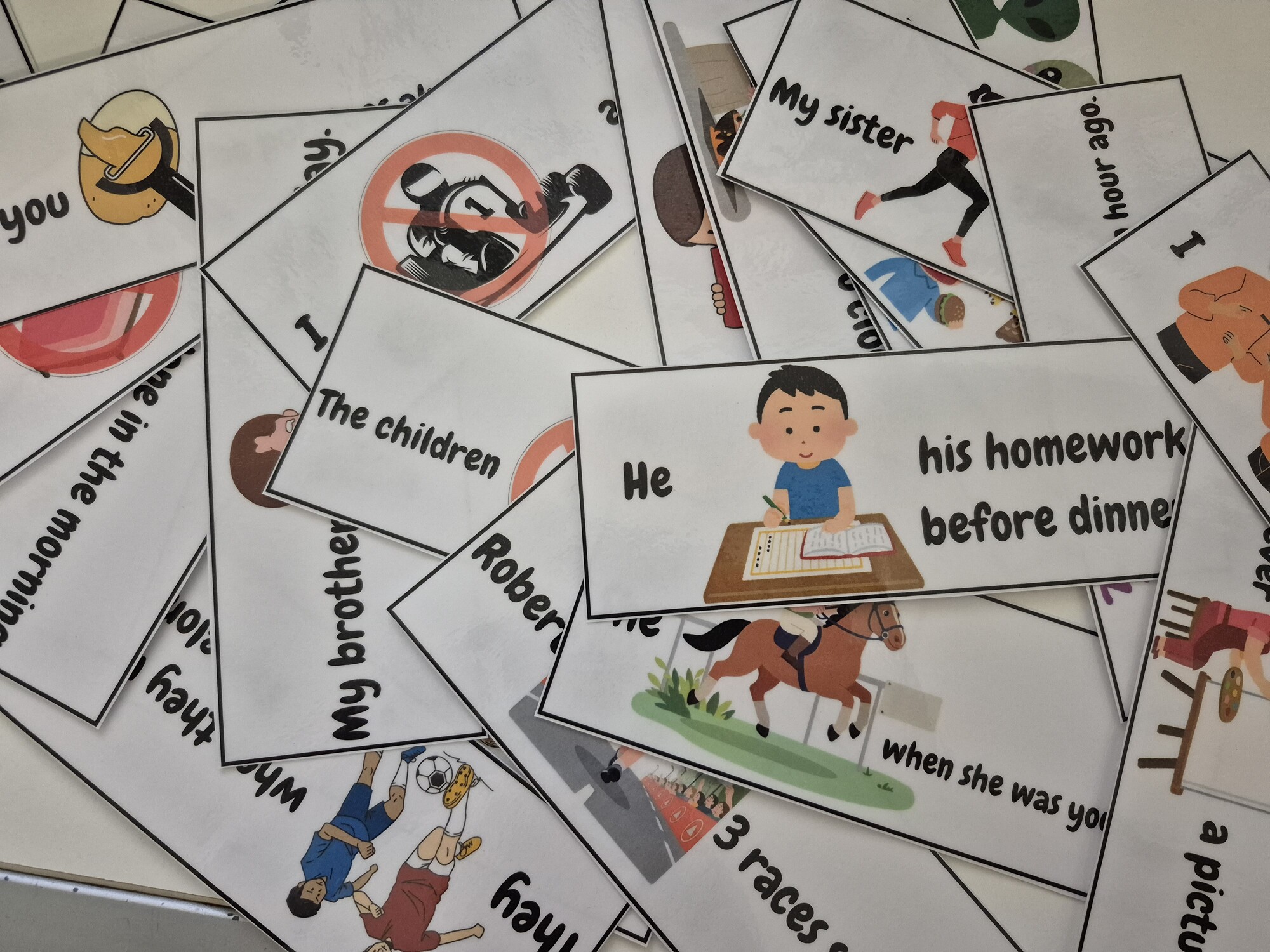 - žáci si postupně tahají kartu, kdo řekne větu správně, kartu si nechává. Kdo řekne větu špatně, dá ji dospodu balíčku.