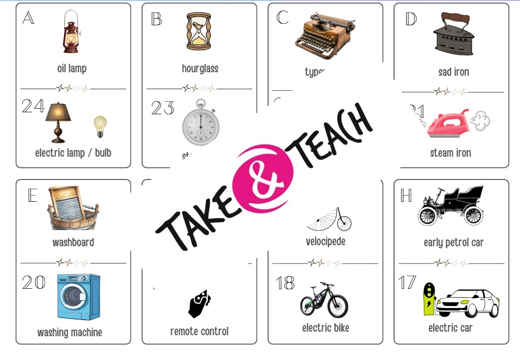 2. 24 kartiček s dvojicemi obrázků - retro věc a dnešní věc pro porovnání (žáci porovnávají jejich použití kdysi a dnes)