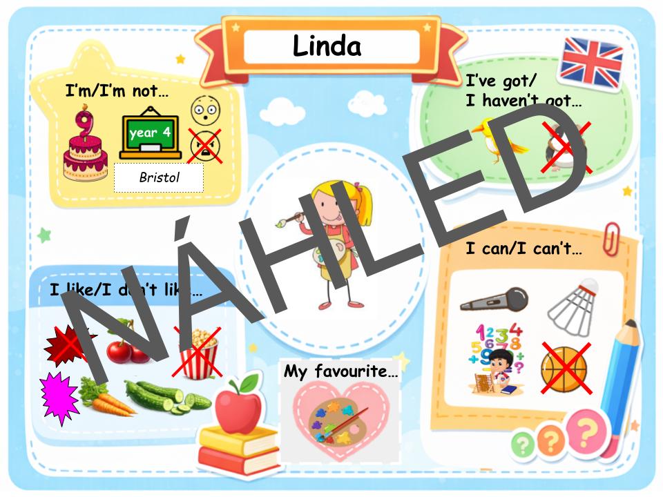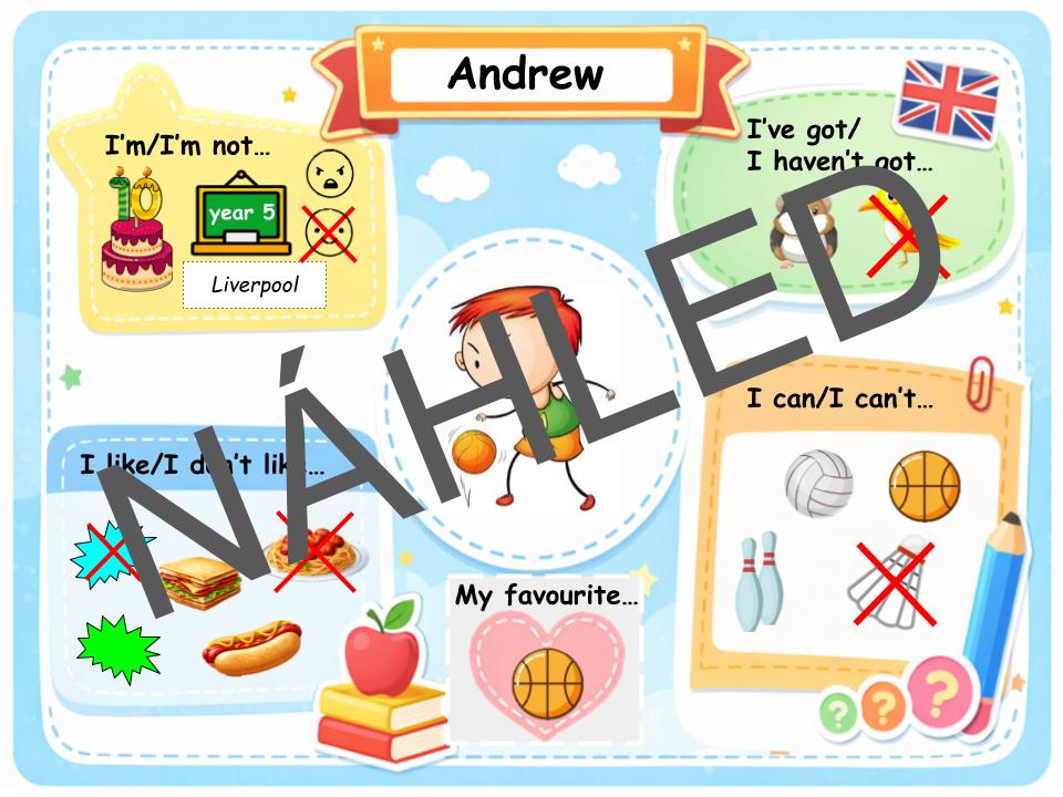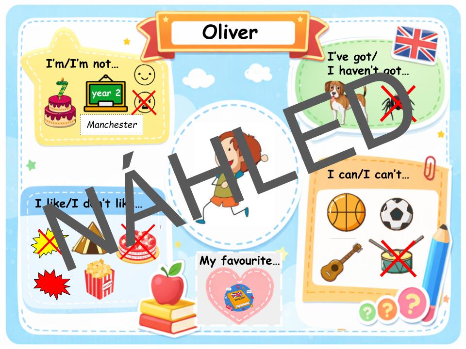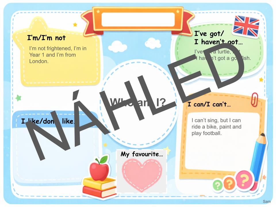 Sada karet a úkolů pro výuku anglického jazyka na 1. stupni ZŠ. Žáci si díky nim procvičí základní gramatické struktury (slovesa „to be“, „have got“, „can“ a vazby „like/don't like“, „My favourite”), konverzaci a slovní zásobu.