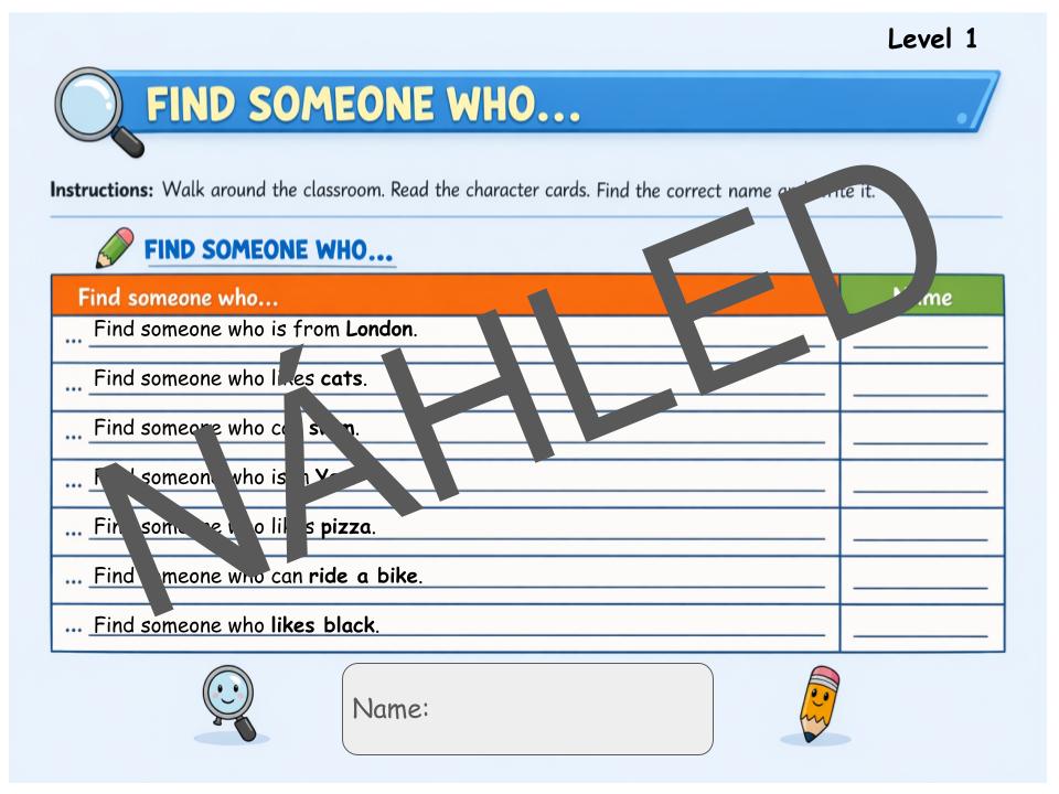 Personal Cards, Who am I, Find someone who…