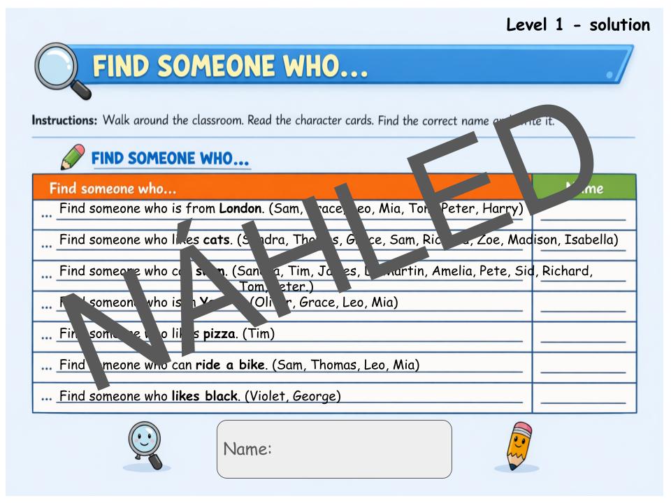 • Aktivita „Find someone who...“: Tři úrovně náročnosti (Level 1–3), které vedou žáky k vyhledávání specifických informací v textech. Můžete využít k aktivitě běhací diktát.