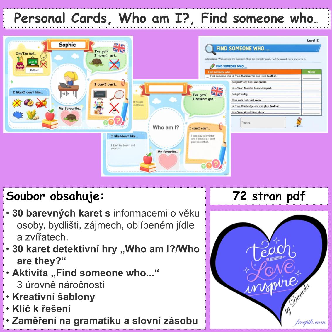 • Detektivní hra: „Who am I? / Who are they?“: žáci identifikují postavy z karet na základě nápovědných informací na kartě.