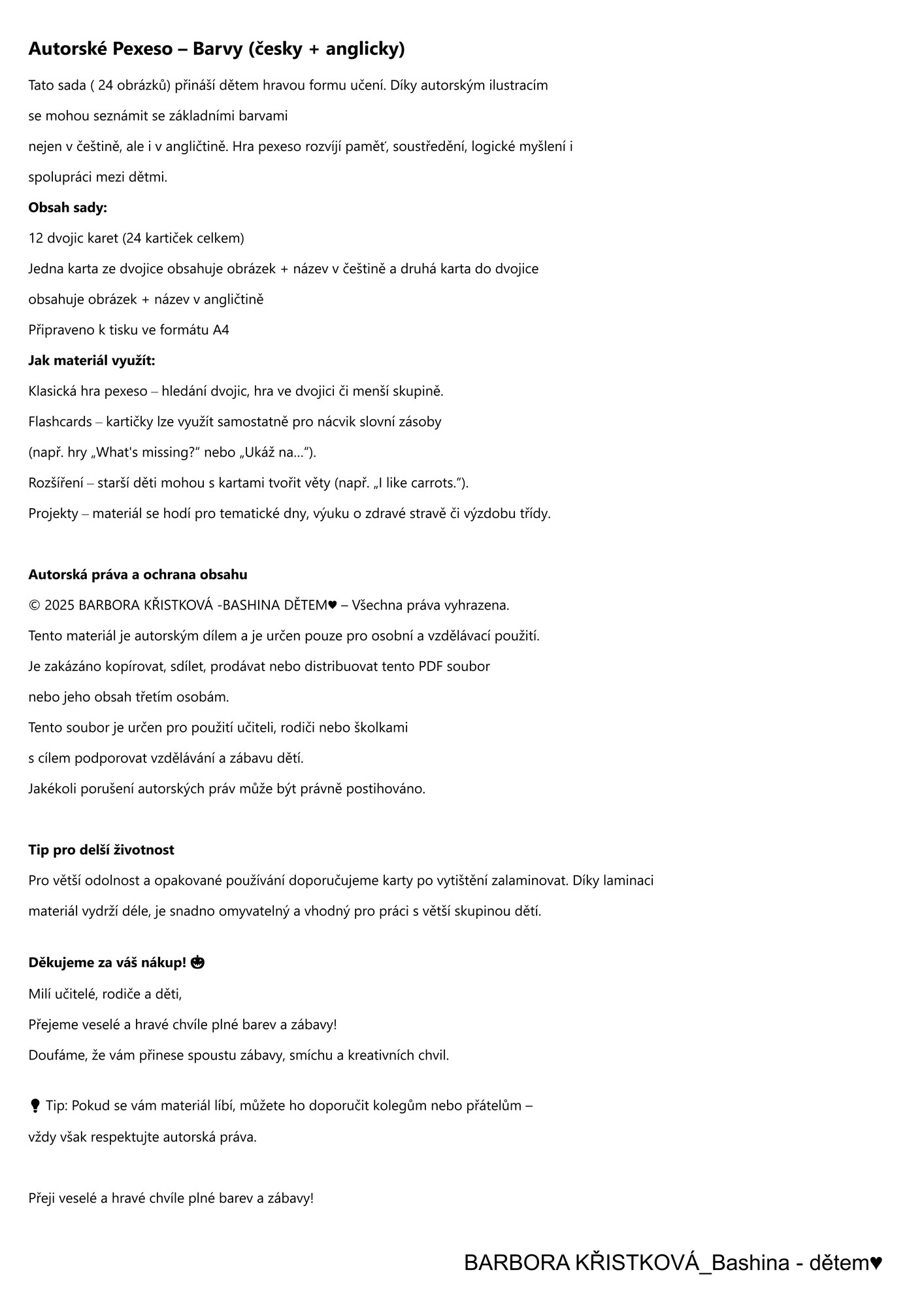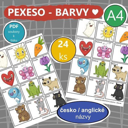Sada 12 dvojic karet (24 kartiček) s autorskými ilustracemi BAREV . Každá karta obsahuje název v češtině a druhá do dvojice v angličtině. Takže se děti při hraní přirozeně učí novou slovní zásobu.