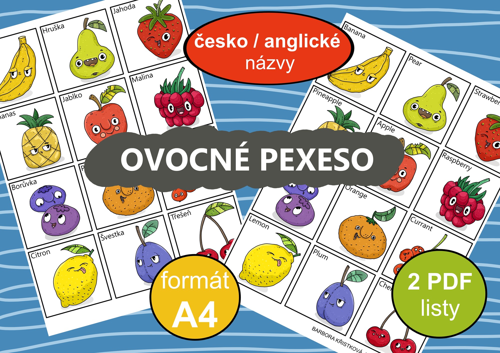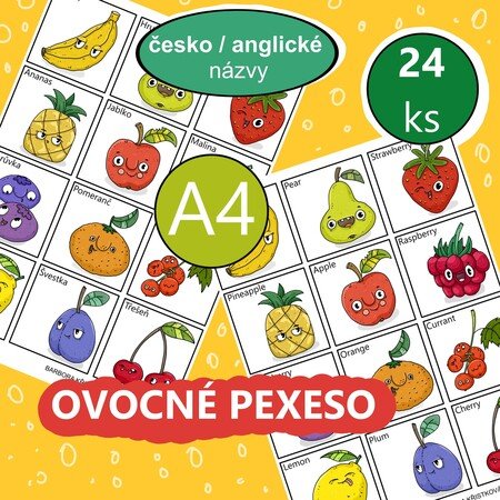 Sada 12 dvojic karet (24 kartiček) s autorskými ilustracemi ovoce . Každá karta obsahuje název v češtině a druhá do dvojice v angličtině. Takže se děti při hraní přirozeně učí novou slovní zásobu.