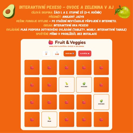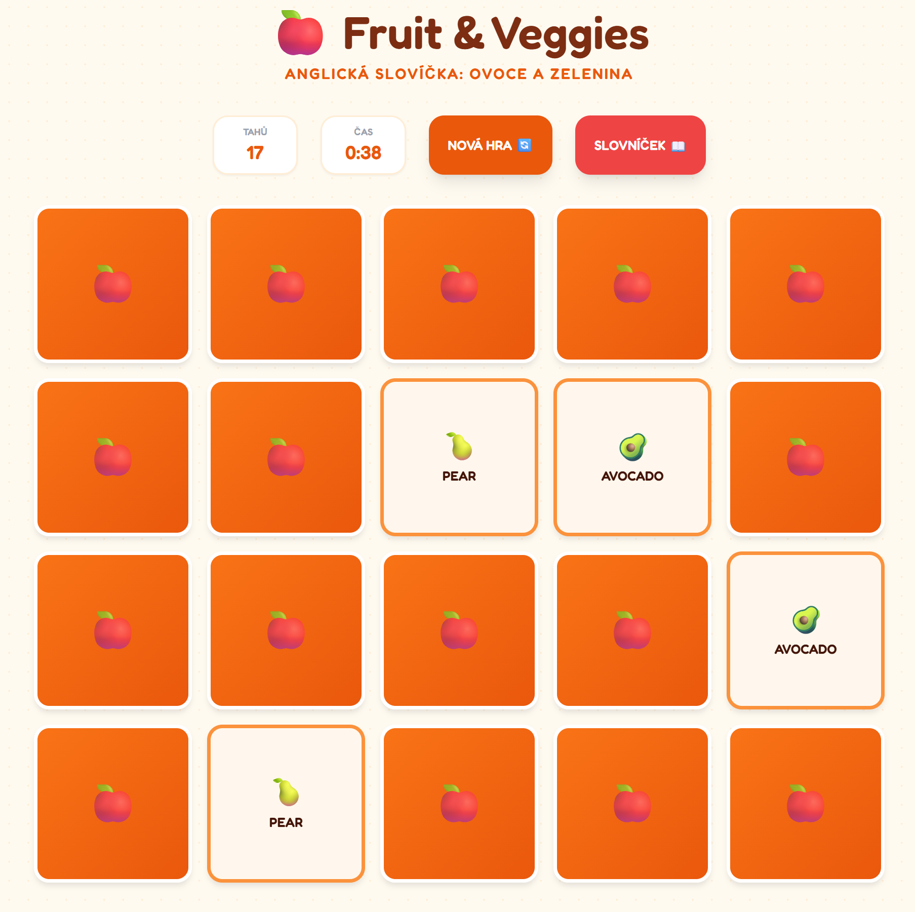 - Variabilita: Hra při každém spuštění náhodně vybírá 10 dvojic z bohaté databáze 22 různých plodů (např. avocado, eggplant, cherry, garlic), takže se rychle neomrzí.