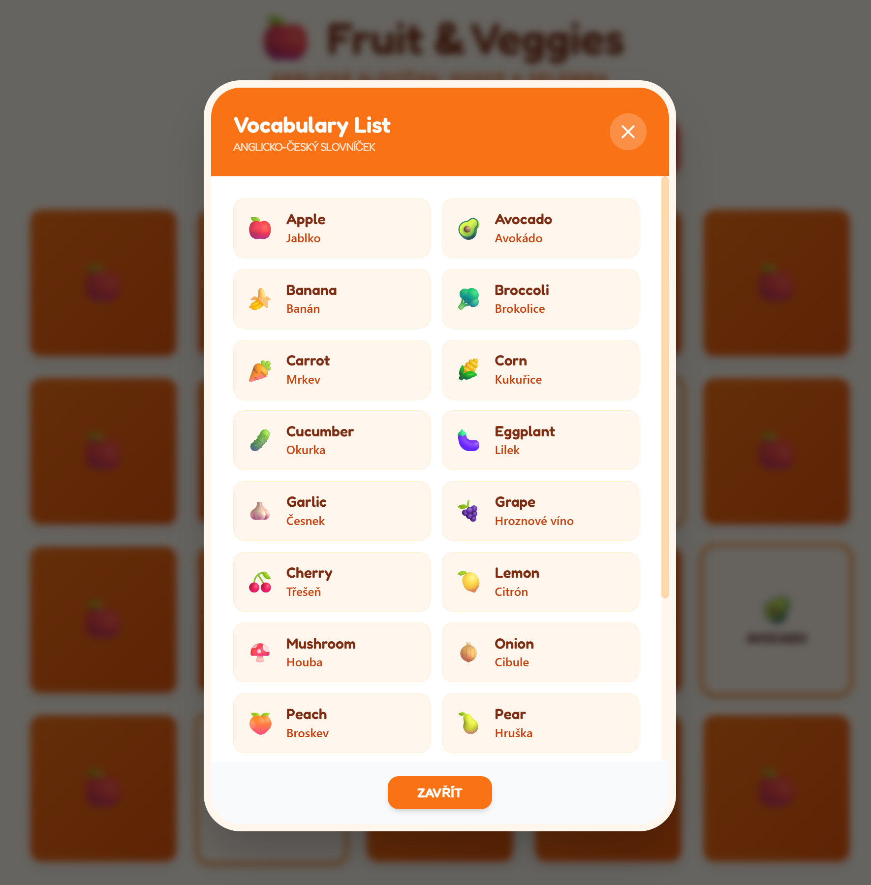 Interaktivní digitální hra pro výuku angličtiny, která hravou formou pomáhá žákům 1. stupně ZŠ (začátečníkům) osvojit si slovní zásobu na téma ovoce a zelenina.