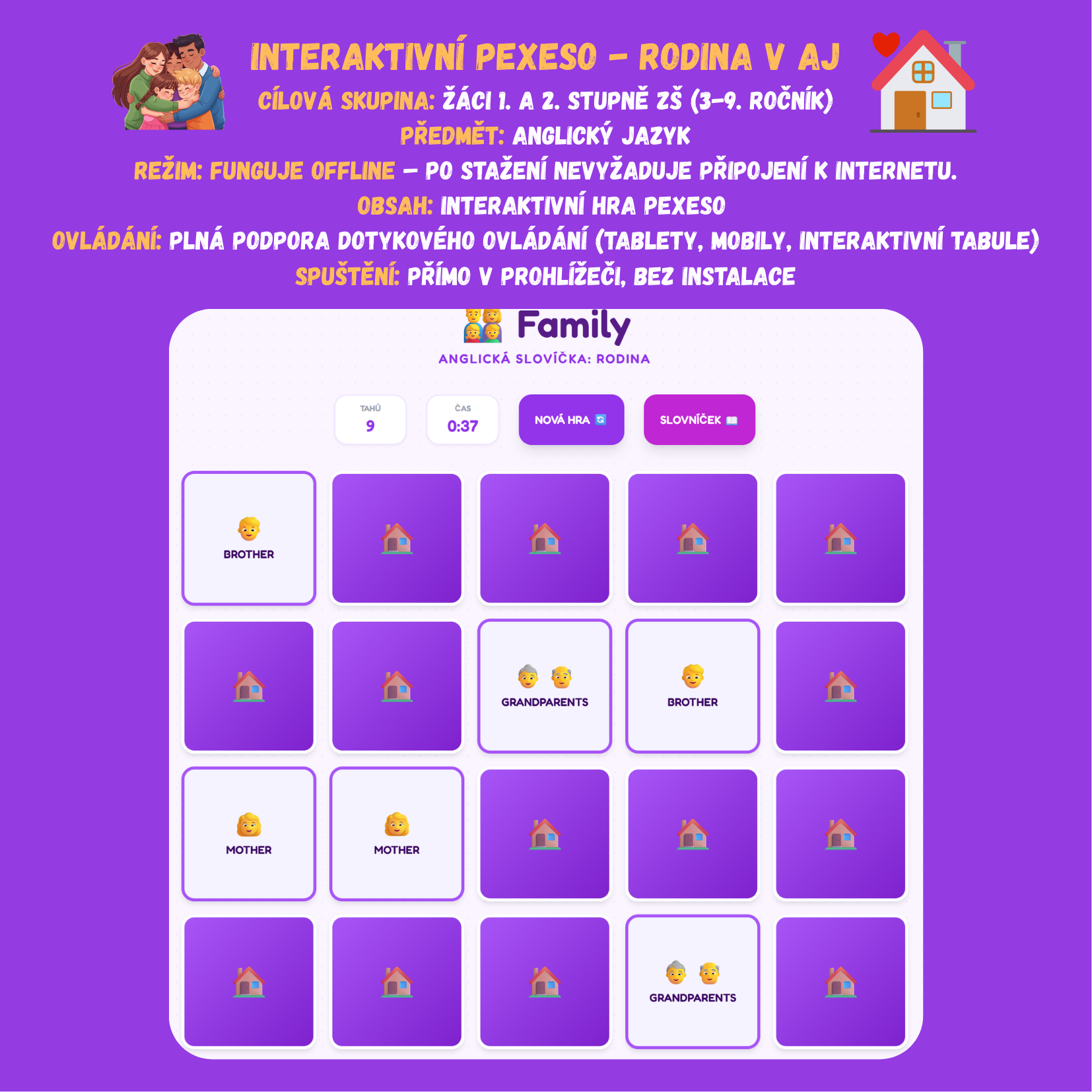 Tato interaktivní digitální hra je ideálním nástrojem pro procvičování a fixaci slovní zásoby na téma „Rodina“ (Family) v hodinách anglického jazyka. Je určena zejména pro žáky 1. stupně ZŠ, od úplných začátečníků po mírně pokročilé.