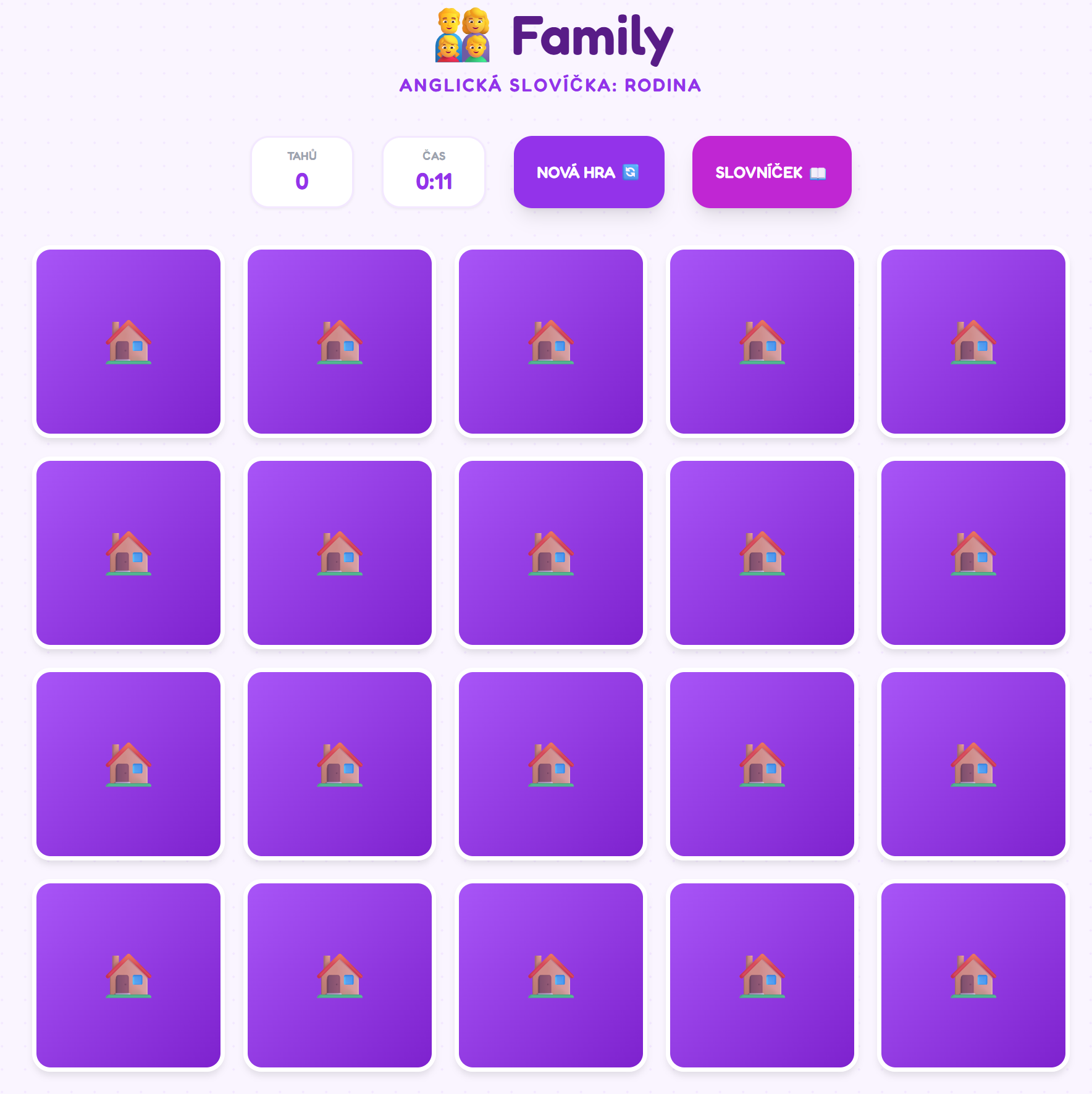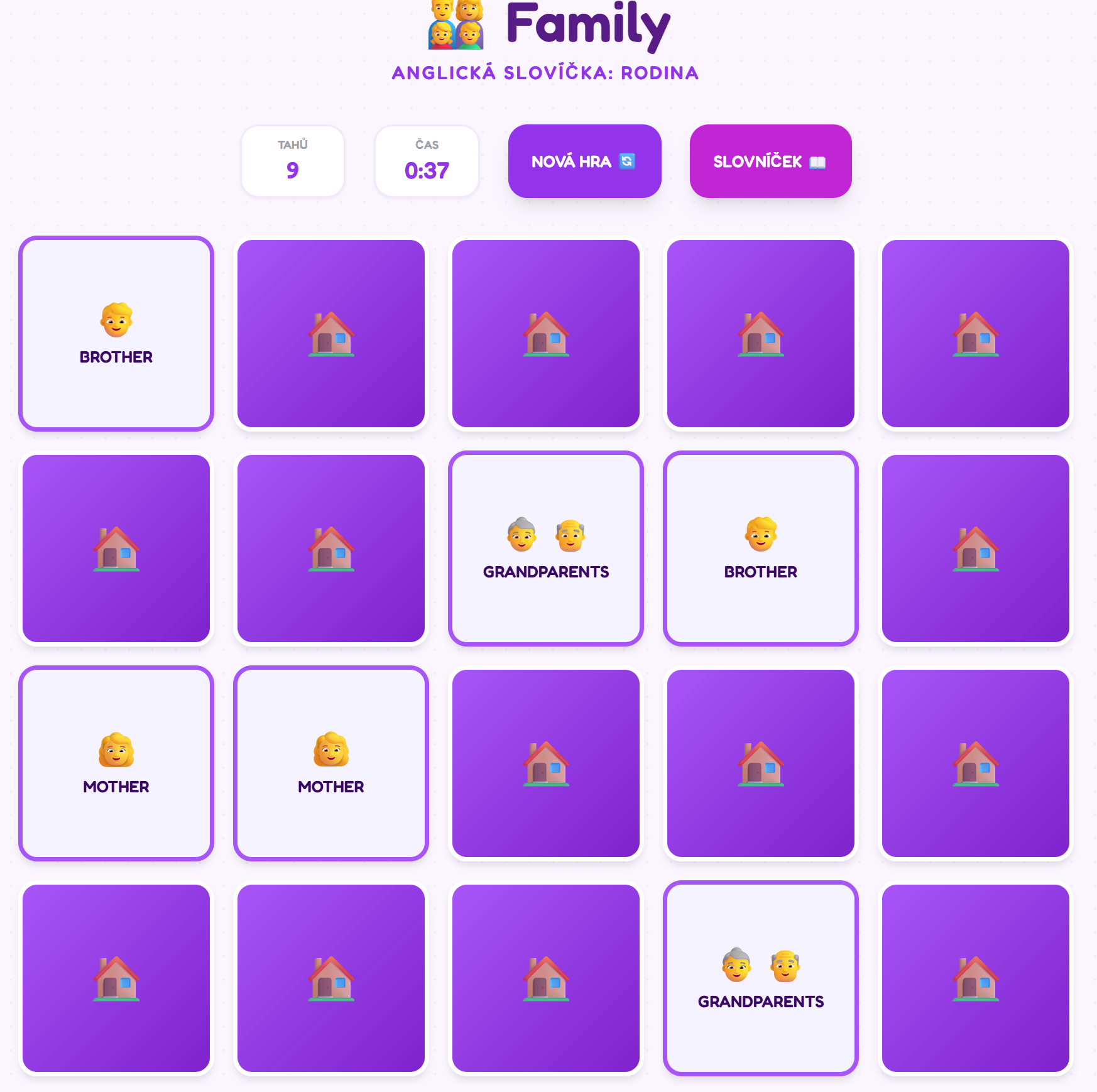 - Vizuální podpora: Každé slovíčko je doplněno tematickým emodži (např. Grandmother 👵), což pomáhá dětem lépe si zapamatovat význam bez nutnosti překladu.