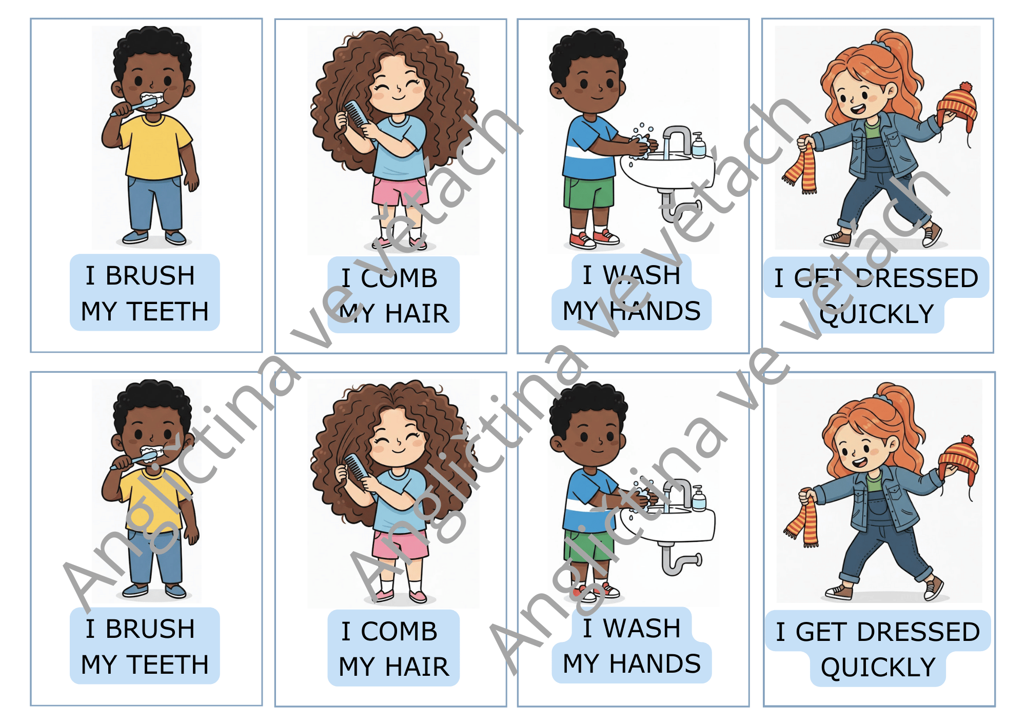 Všechny kartičky jsou napsány v první osobě (I WAIT FOR A BUS).