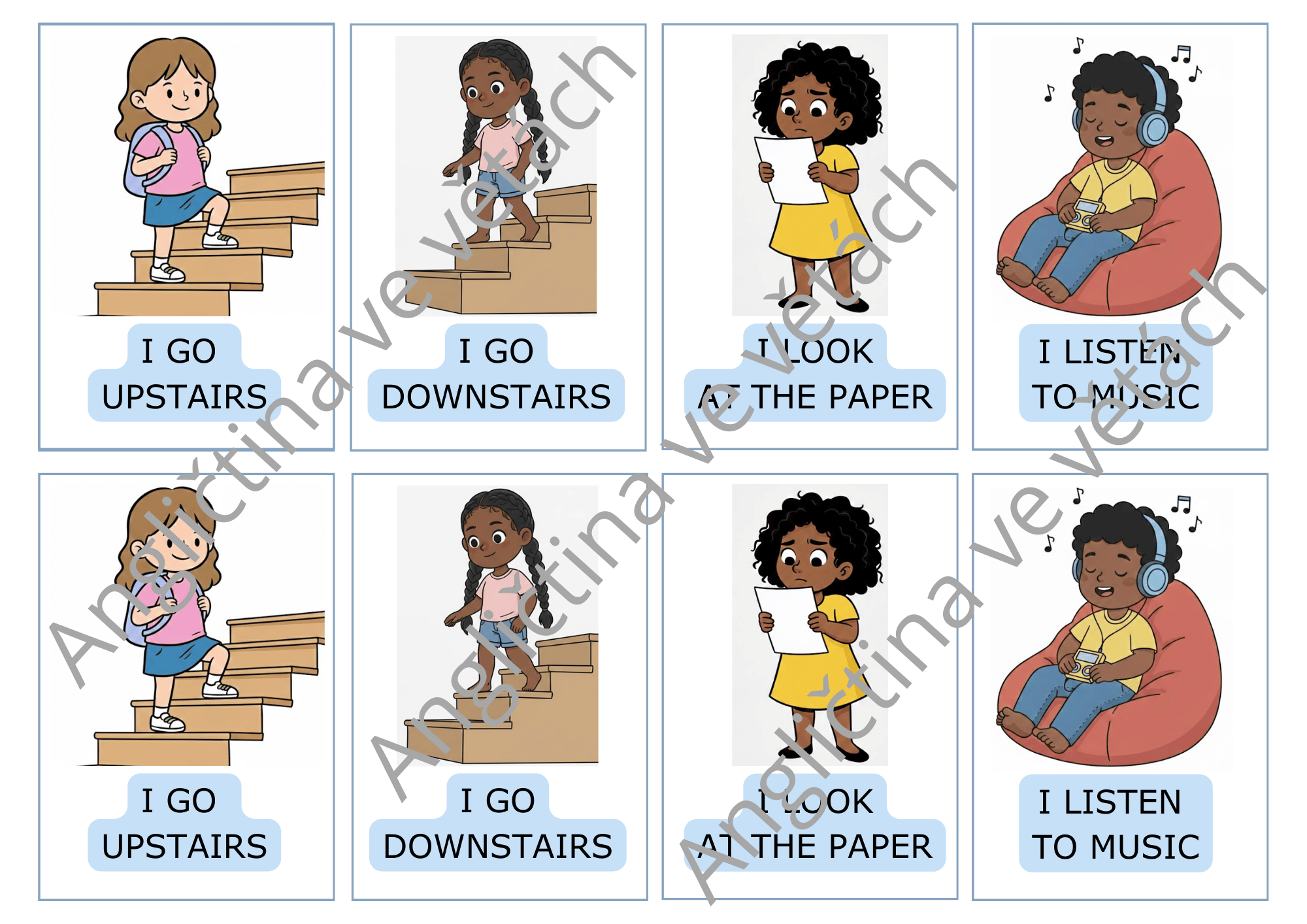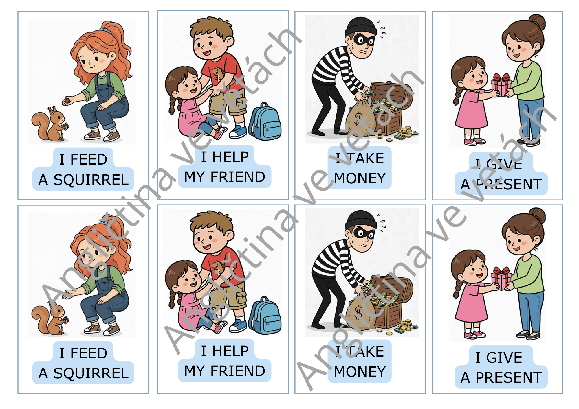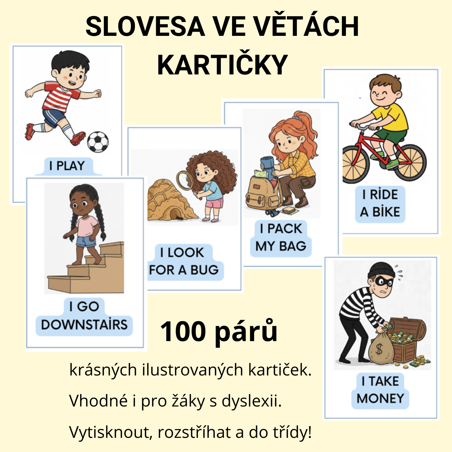 Každá kartička obsahuje krátkou větu s jedním se základních anglických sloves.