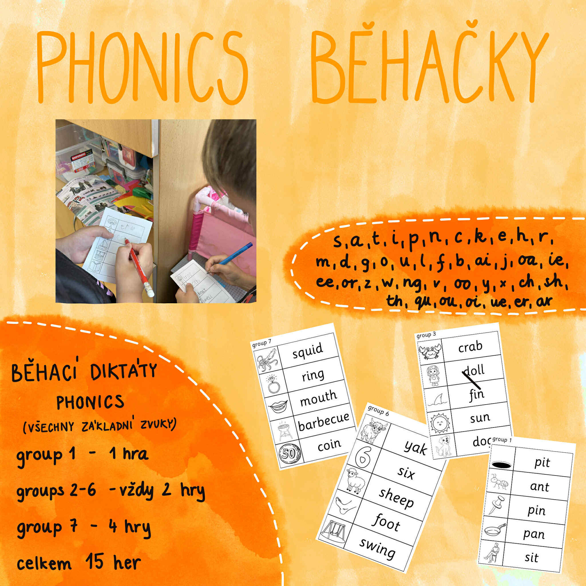 V dokumentu najdete 15 sad “běhaček” se slovy a obrázky rozdělenými podle 7 skupin, které se učíme v rámci metody výuky angličtiny pomocí jednotlivých zvuků. Obsaženy jsou tedy slova se základními hláskami.