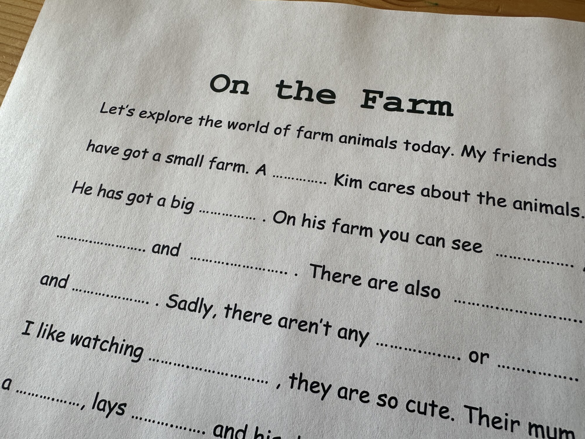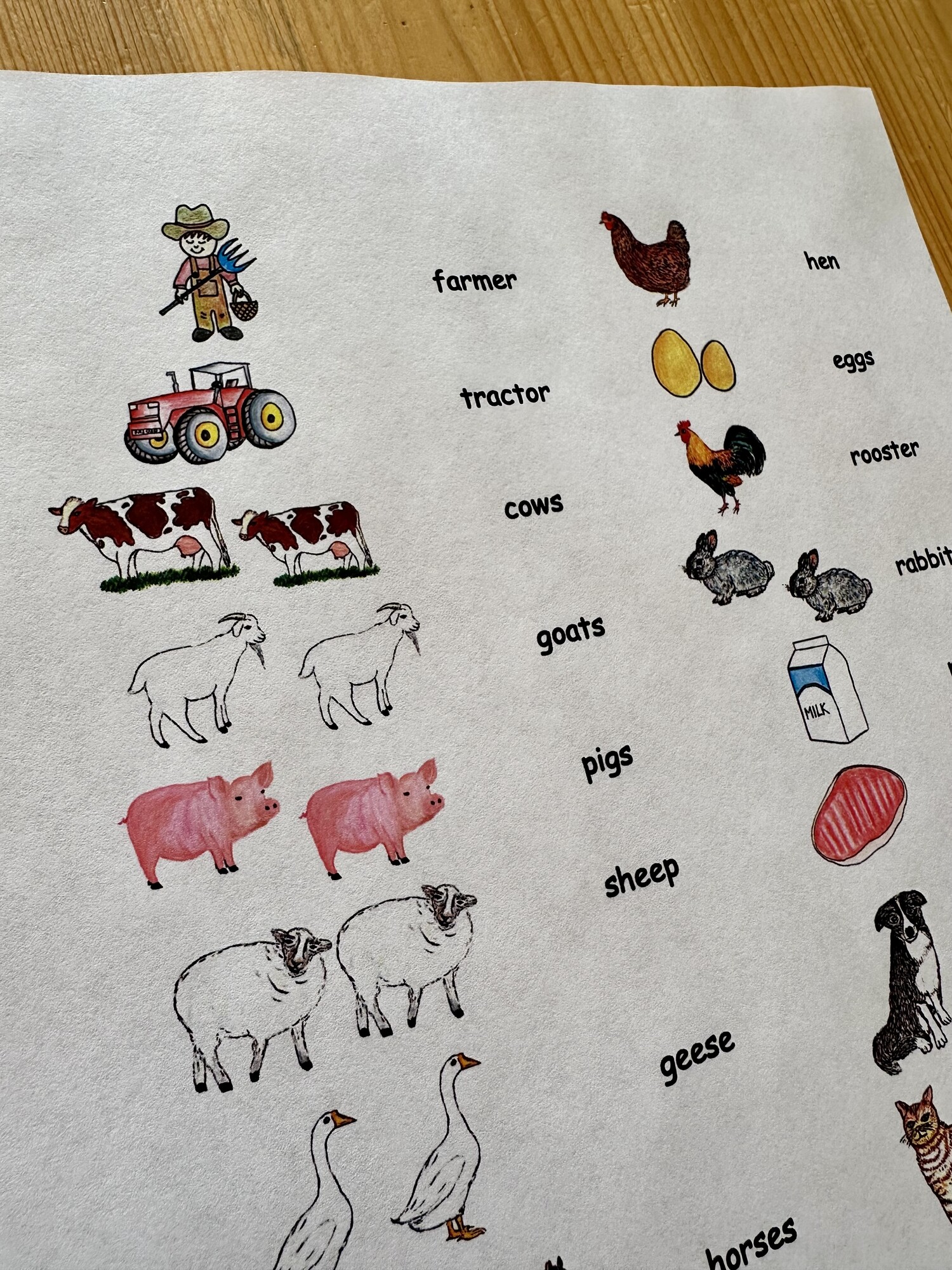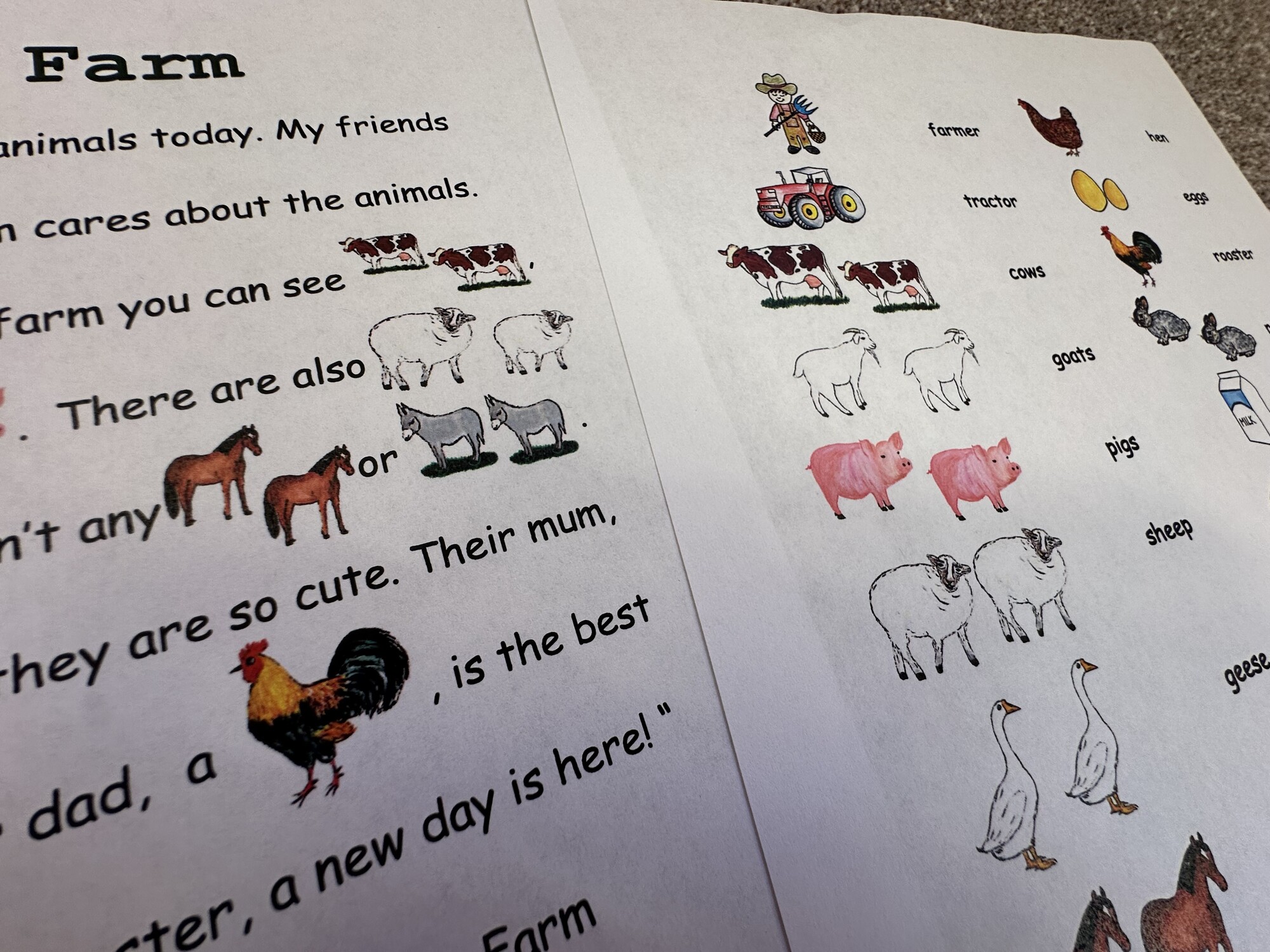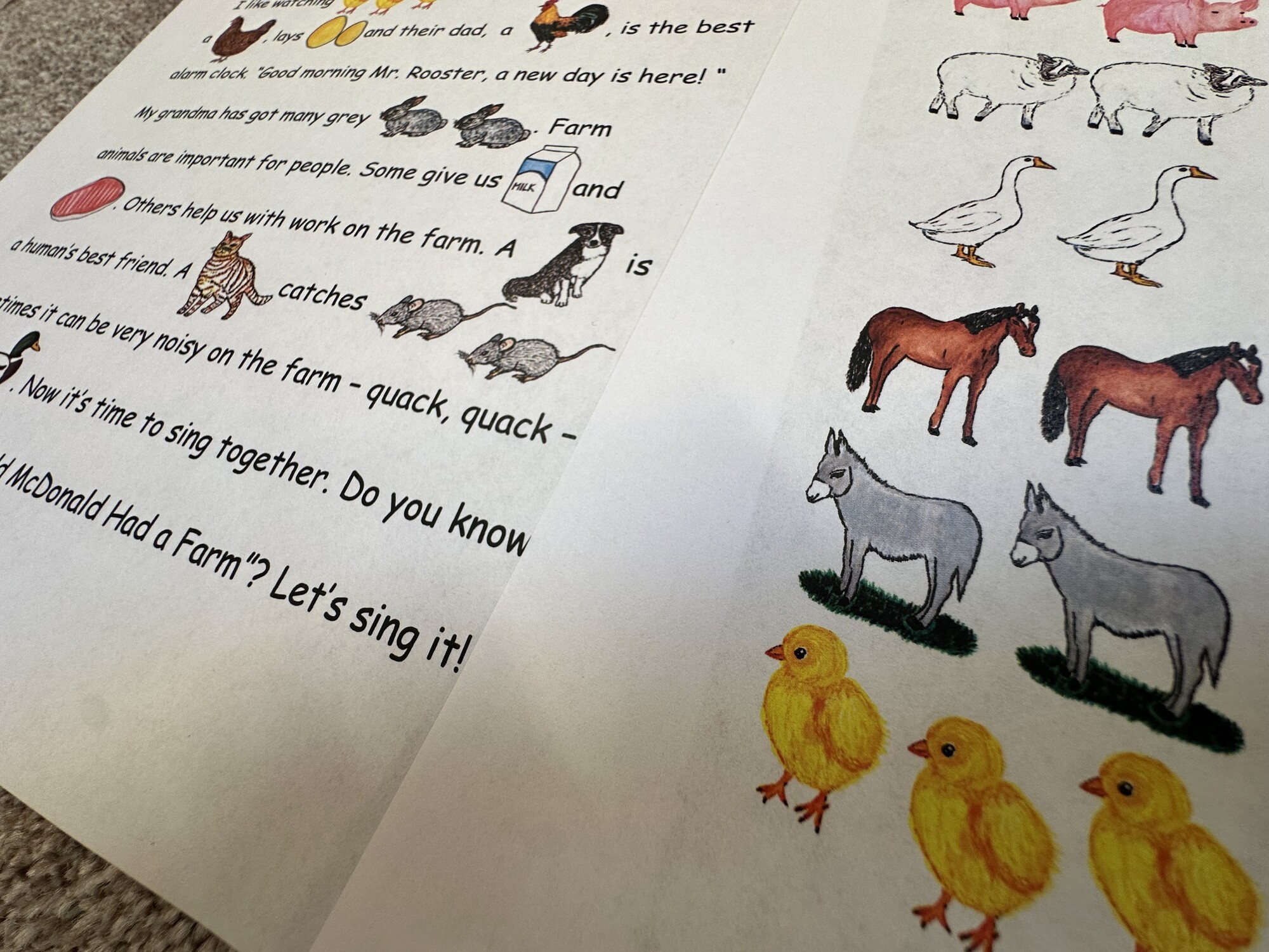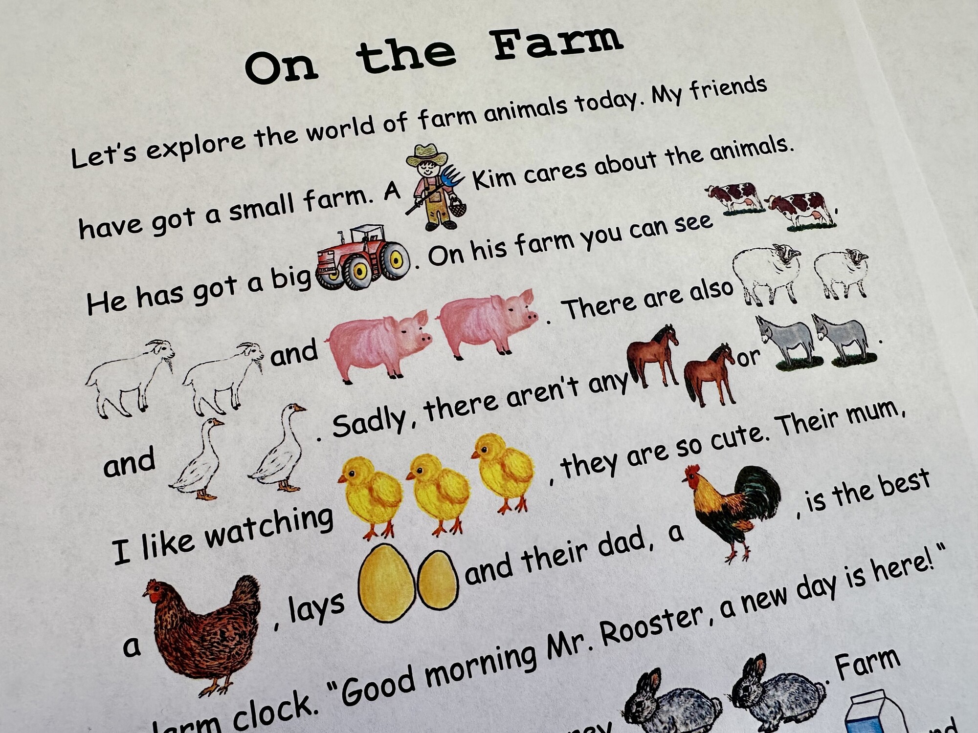 Materiál obsahuje 3 A4 strany – text ke čtení na téma On the Farm, obrázkový slovníček, text k procvičení psaní. Materiál může sloužit dětem k inspiraci – děti po přečtení mohou tvořit vlastní texty s obrázky. Ručně malované obrázky.